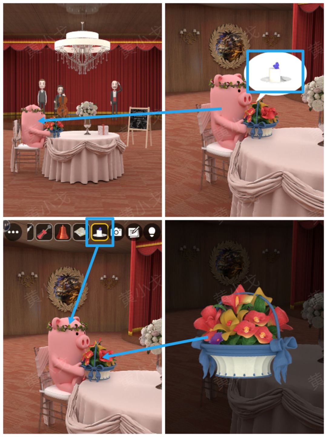 2.点击猪猪,拿【一块蛋糕】给它,获得【花篮】