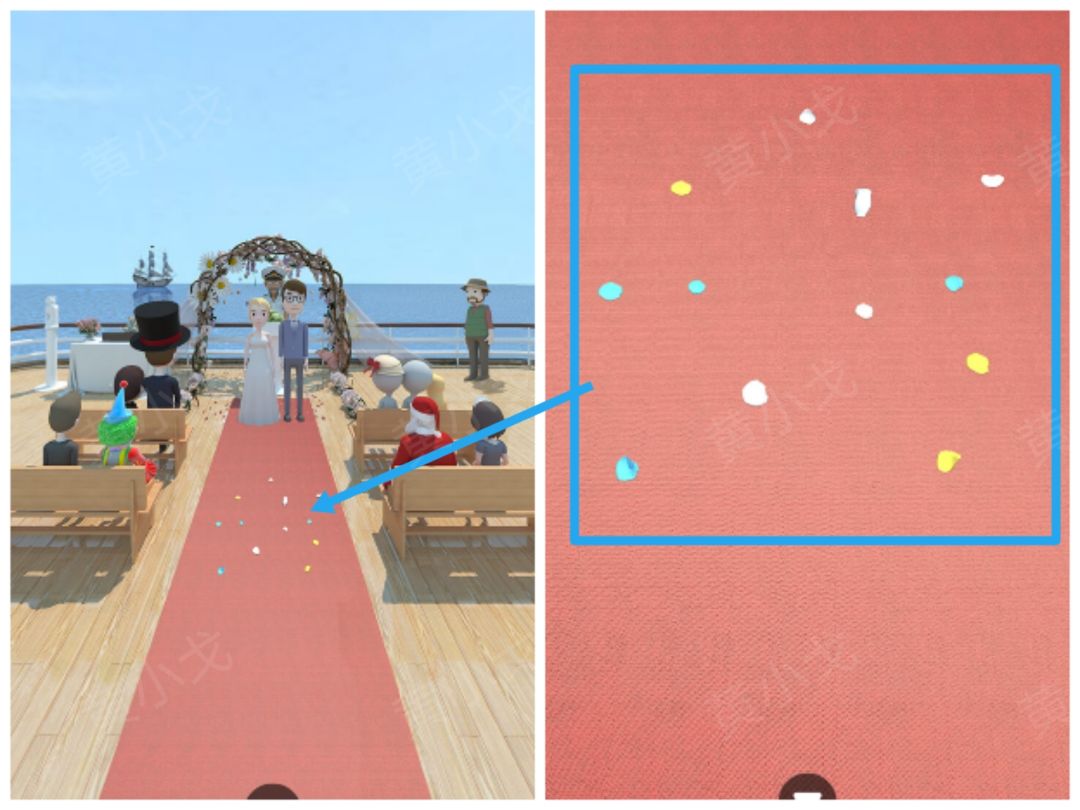 🔶[婚礼现场]场景花瓣的颜色及数量:白-5、蓝-4、黄-3