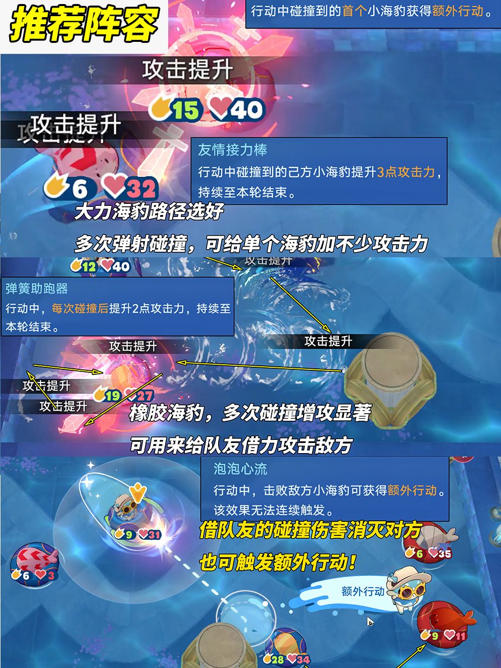 ①使用大力海豹尽可能多的碰撞橡胶海豹,为其叠加攻击力,若是技术到位可依靠反弹等操作增加碰撞次数,尽可能多的叠加攻击力。必拿祝福大力出奇迹‘首次命中的海豹可额外行动’,让橡胶海豹1轮2动,叠加更夸张的攻击力~