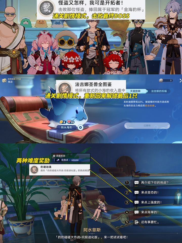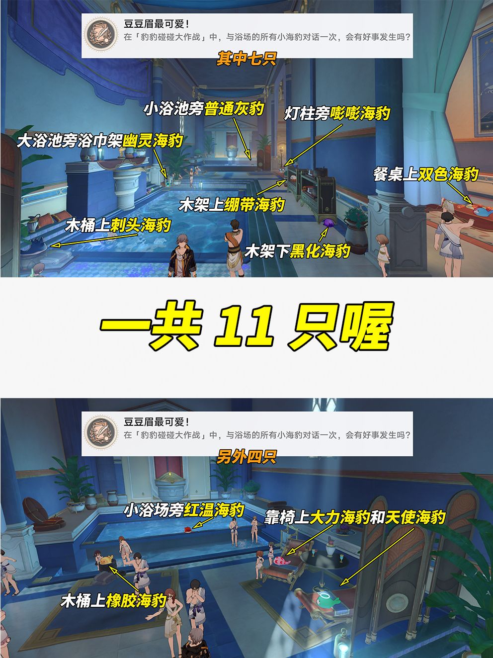 《豆豆眉最可爱!》剧情模式做完,与当前区域内所有海豹都对话1次,即可触发。一共11只海豹,部分隐藏较隐蔽,找不到的玩家可重点排查以下几个区域‘浴池围栏不起眼的普通灰豹、活动入口NPC阿波菲斯背后浴巾架、浴场木架底下、浴场外餐桌上’。具体见图
