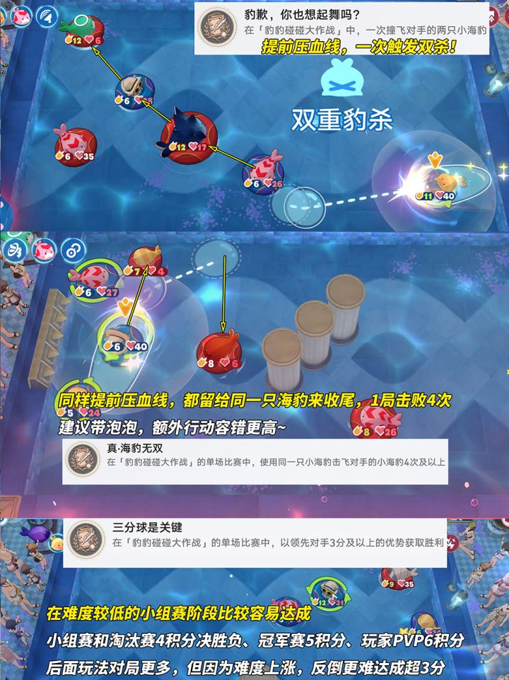 《豹歉,你也想起舞吗?》建议主动压低对方血量,确保下一次可利用弹射轨迹,触发‘双重豹杀’一次性击败对方2只海豹。