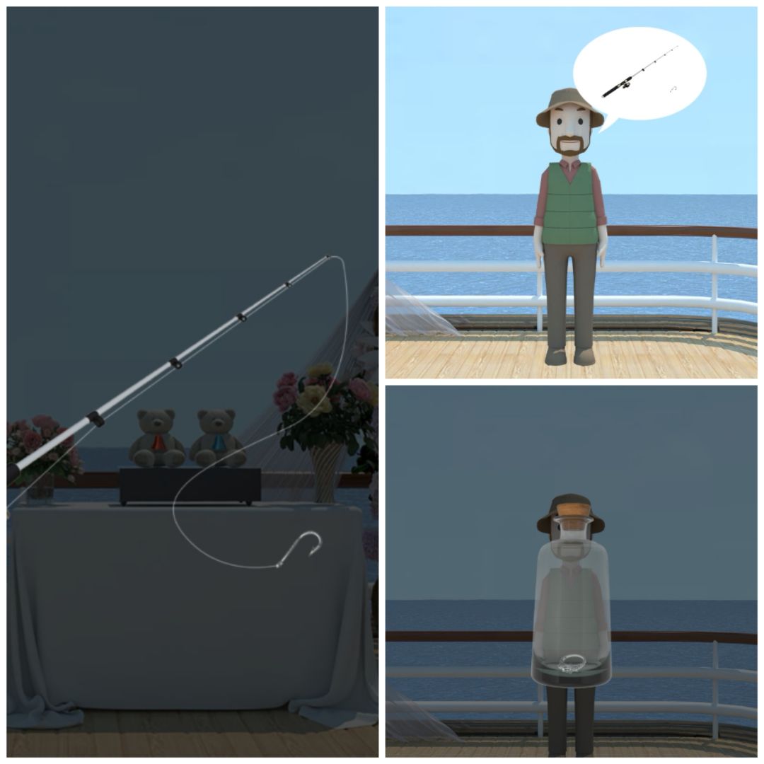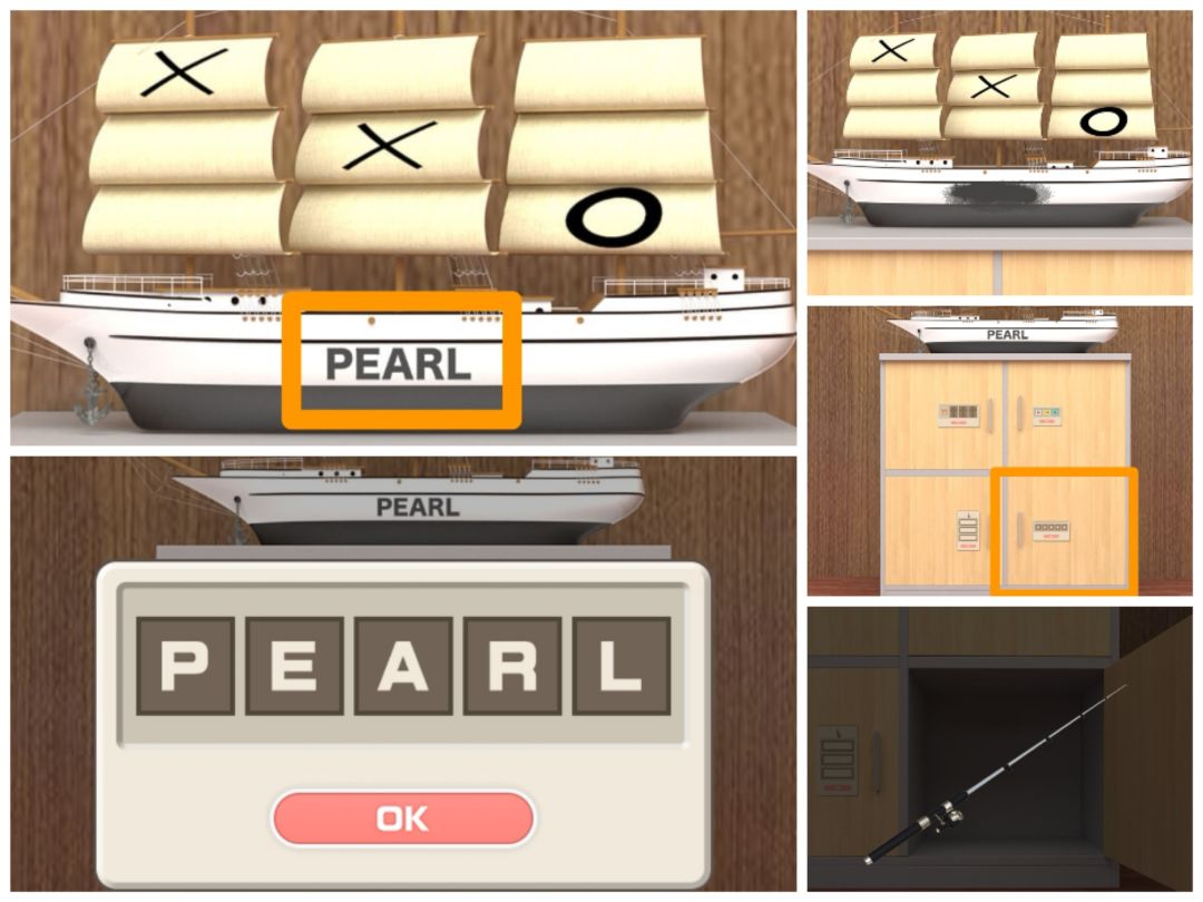 11. 对船模上的污渍使用毛巾,得到字母PEARL,打开船模下的第四个柜子,得到钓鱼竿主体。