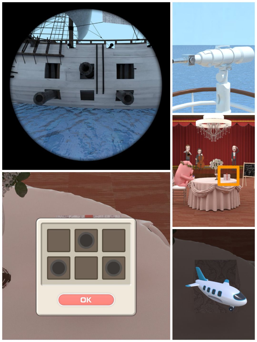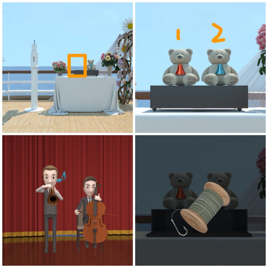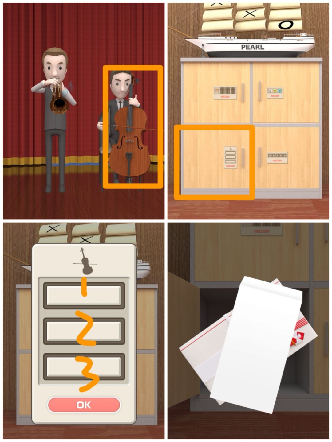 14. 点击大提琴,查看拉弓的位置(上下中下上),可以打开船模下的第三个柜门,得到贺卡及信封。