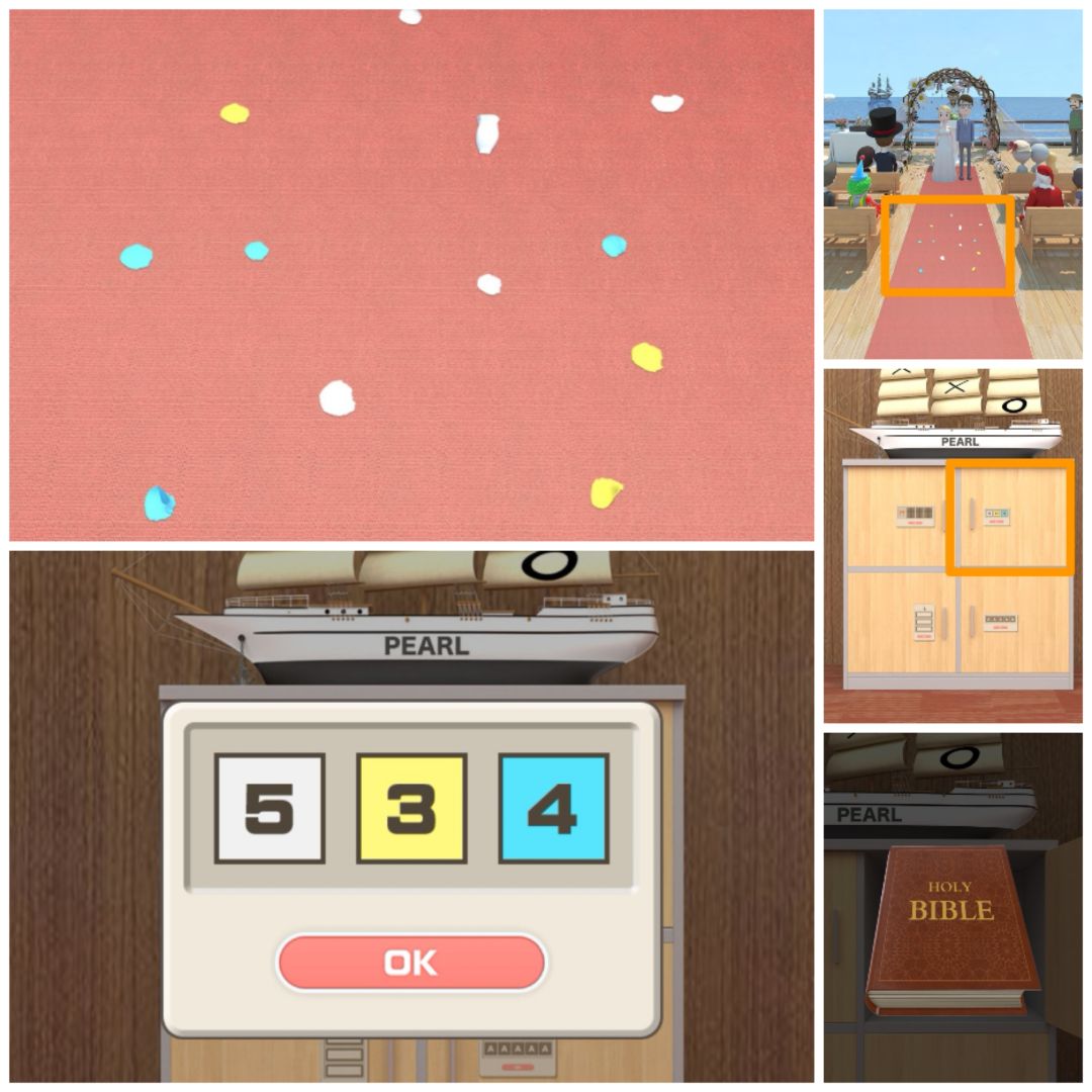 21. 查看室外红毯上的撒花颜色及数量,可以打开船模下的第二个柜子,得到圣经。