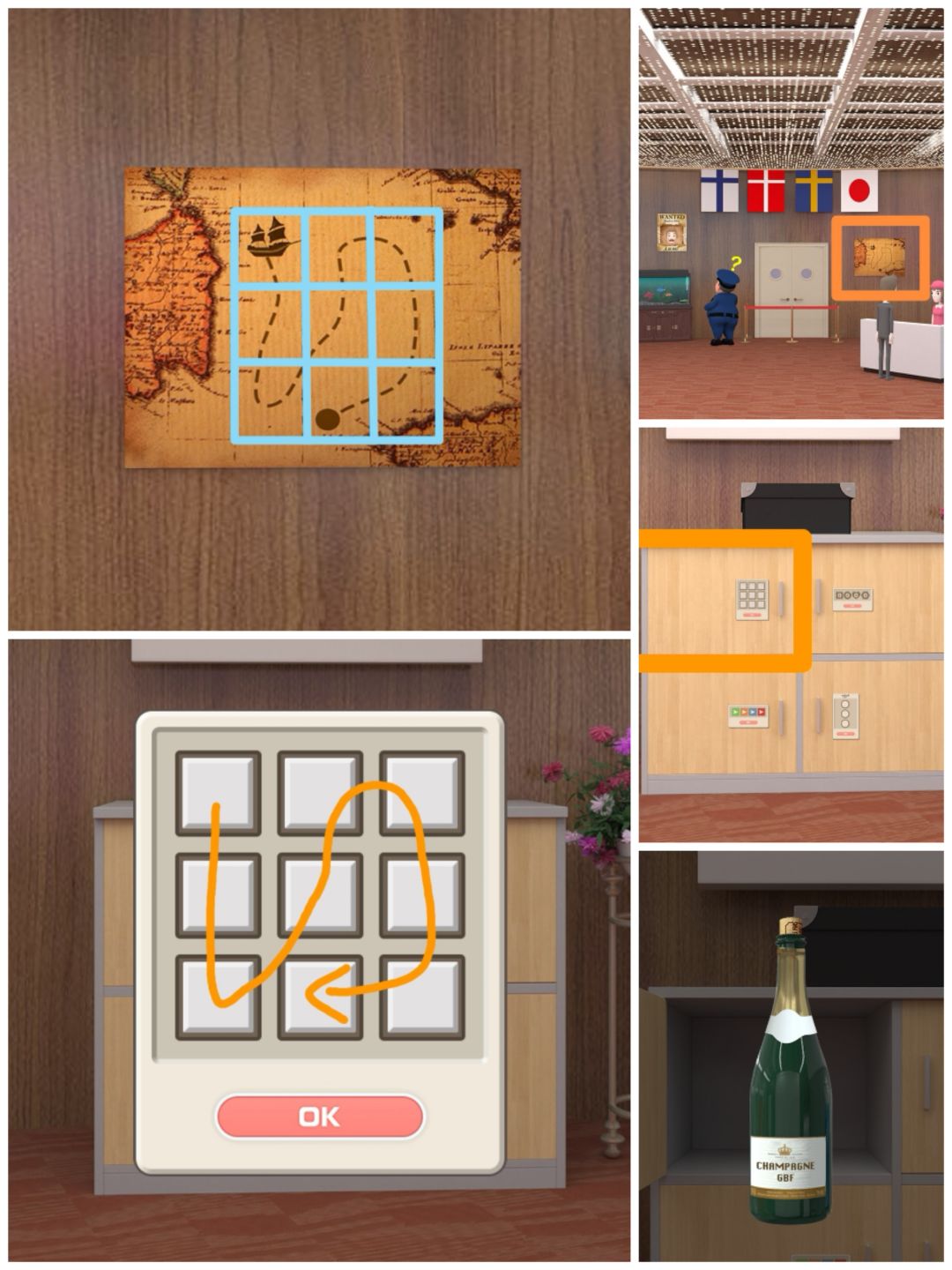 1. 根据墙上的航线图,打开黑盒子下的第一个柜门,得到一瓶香槟。