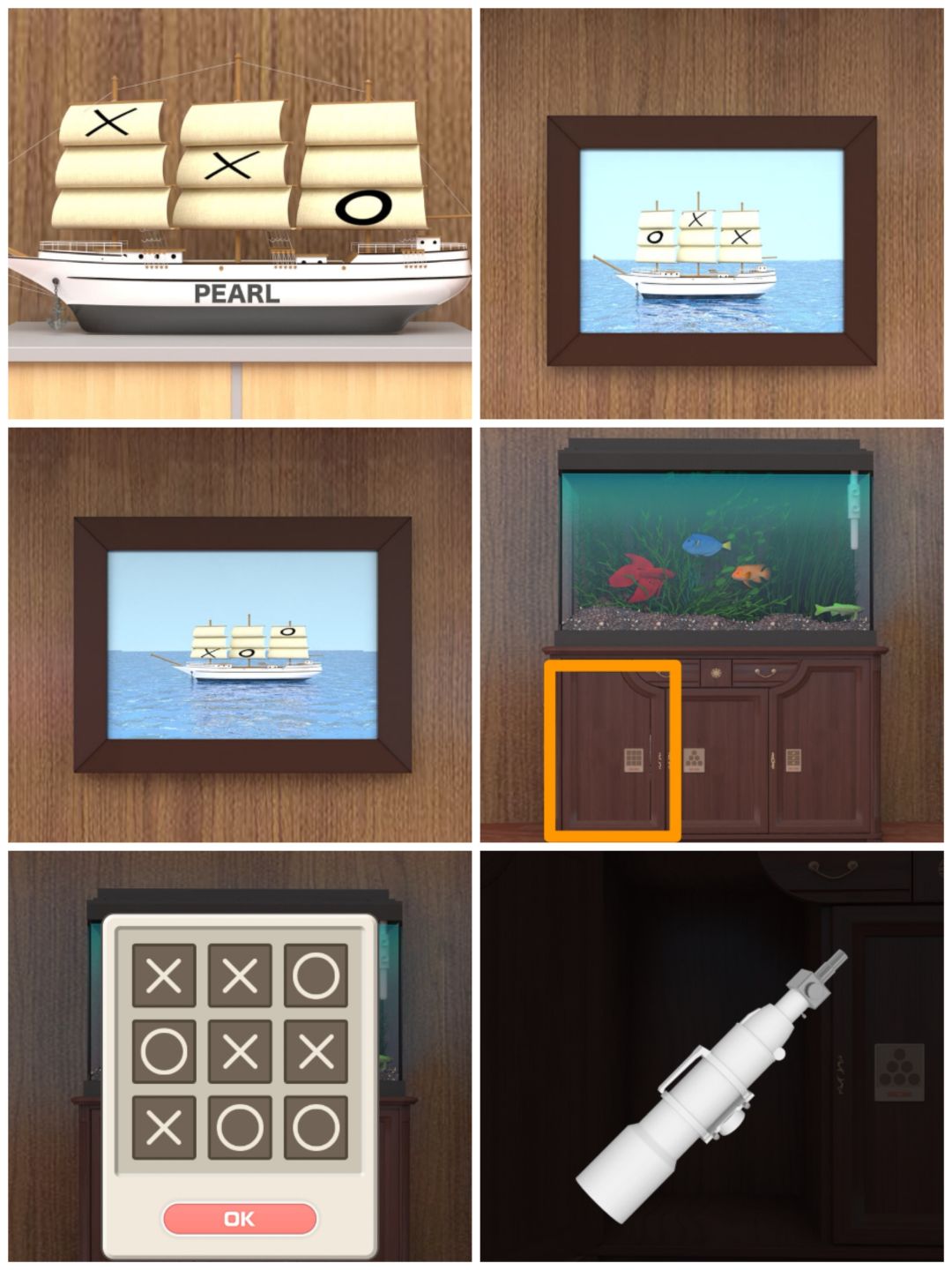 12. 查看船模、船模上方的照片和黑盒子场景墙上的照片,可以打开鱼缸下的第一个柜门,得到望远镜。