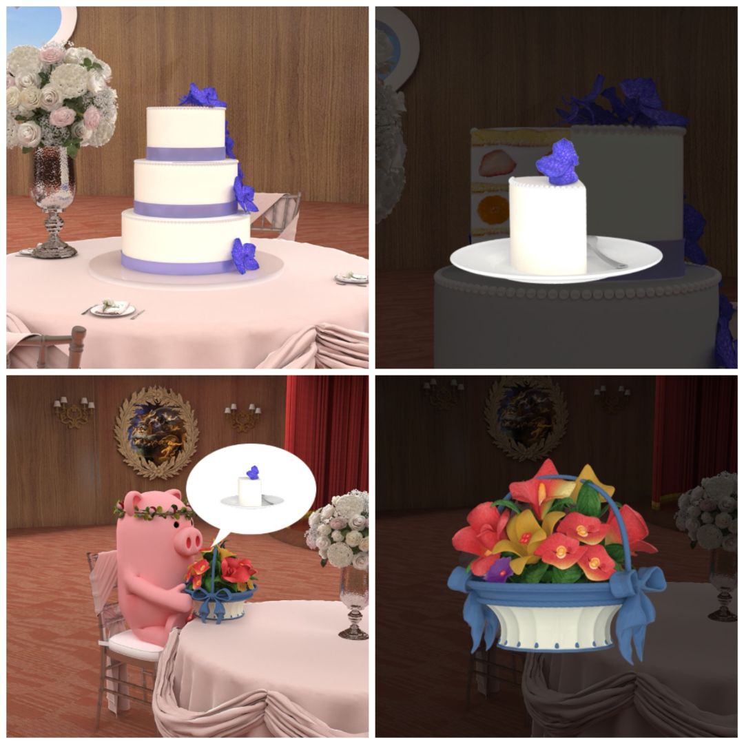 4. 对右边桌上的蛋糕使用小刀,得到一块蛋糕,把蛋糕给小猪,得到花篮。