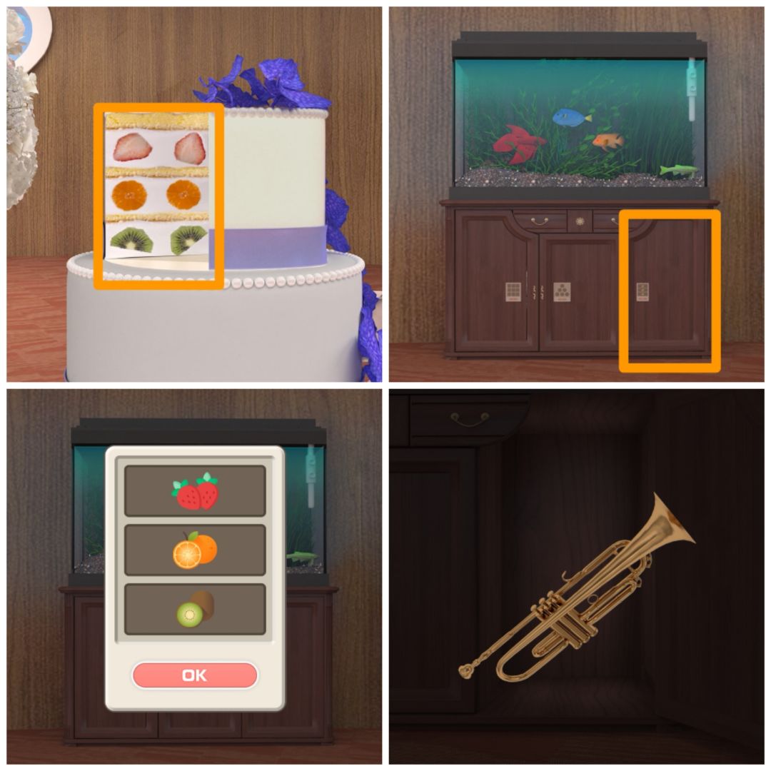 5. 查看桌上蛋糕的切面,根据从上到下的水果顺序,打开鱼缸下的第三个柜门,得到小号。