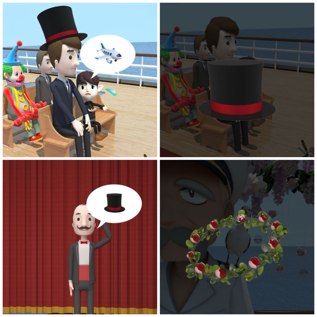 24. 把飞机给小朋友,得到帽子,把帽子给台上右边的人,然后在司仪身上拿到花环。