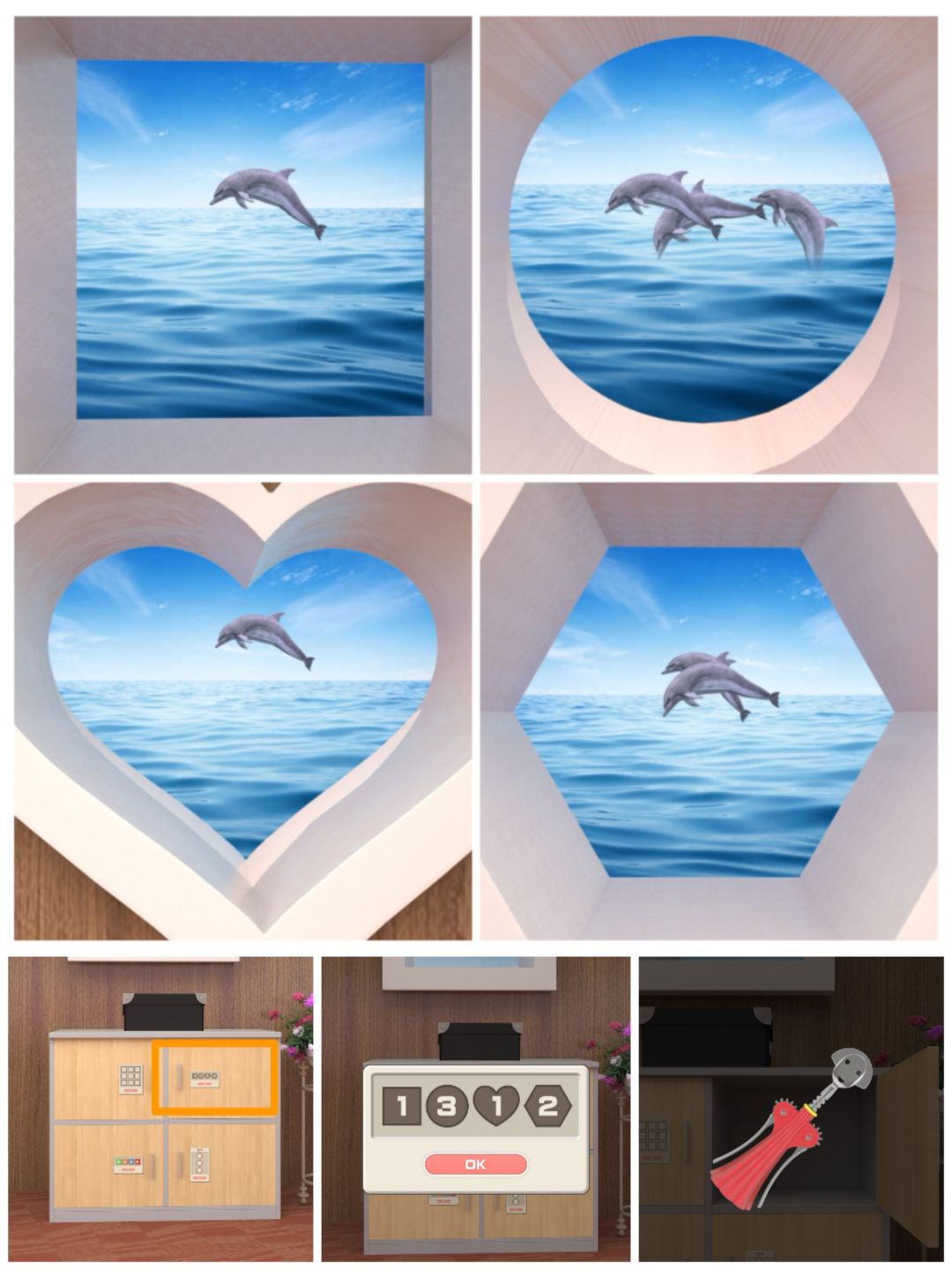 2. 查看四个窗口的海豚数量,打开黑盒子下的第二个柜门,得到开瓶器。