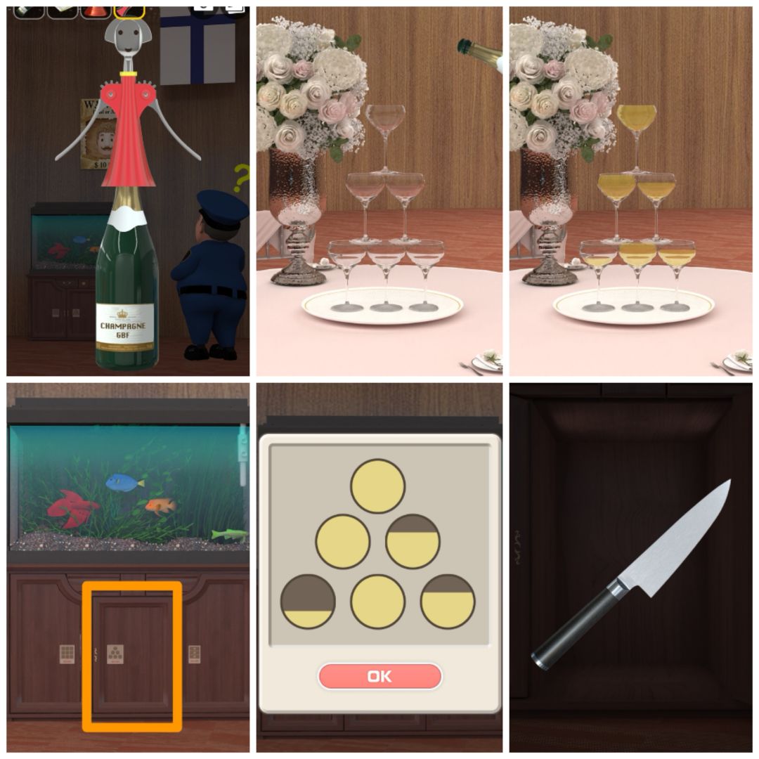 3. 对香槟使用开瓶器,然后倒入左边桌上的高脚杯中,根据杯中液体的高度,打开鱼缸下的第二个柜子,得到小刀。
