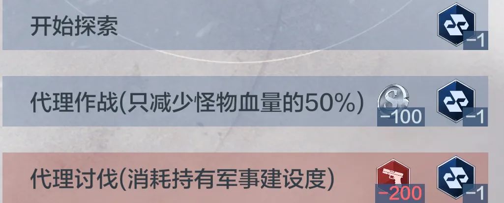 可消耗军事建设度进行代理作战;消耗银币代理作战效果减半,单次只减少怪物50%的血量。