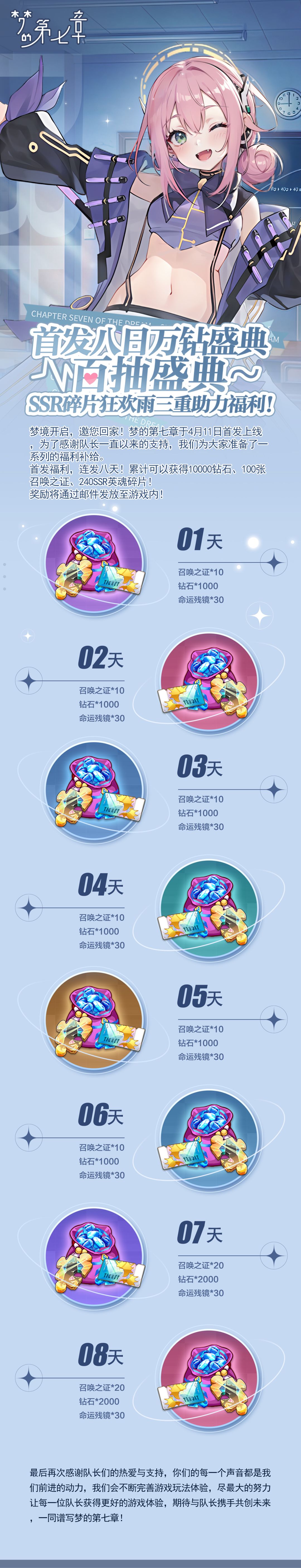 梦的第七章首发八日万钻+百抽盛典+SSR碎片狂欢雨三重助力福利!
