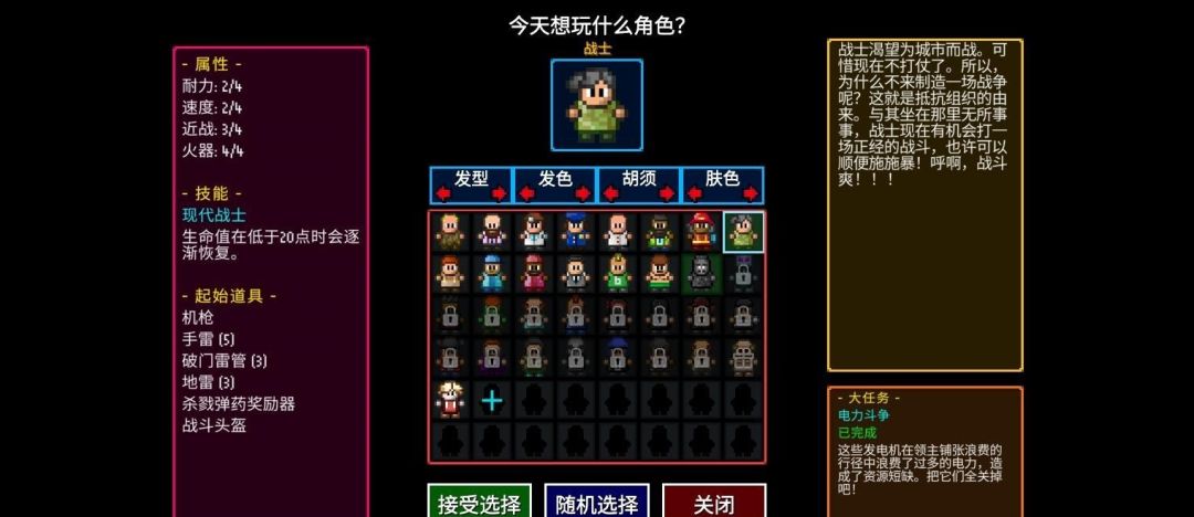 大任务:电力战争,每个关卡摧毁一定量发电机,很简单就能完成,另外有些人可能不知道完成大任务有什么用,完成大任务后可以在领主村获得强化(仅限本局游戏),开启突变“超级特殊能力”并且角色已完成大任务时这局游戏角色就会一直是强化状态,大任务强化的不一定是属性,也有可能是技能或者初始武器