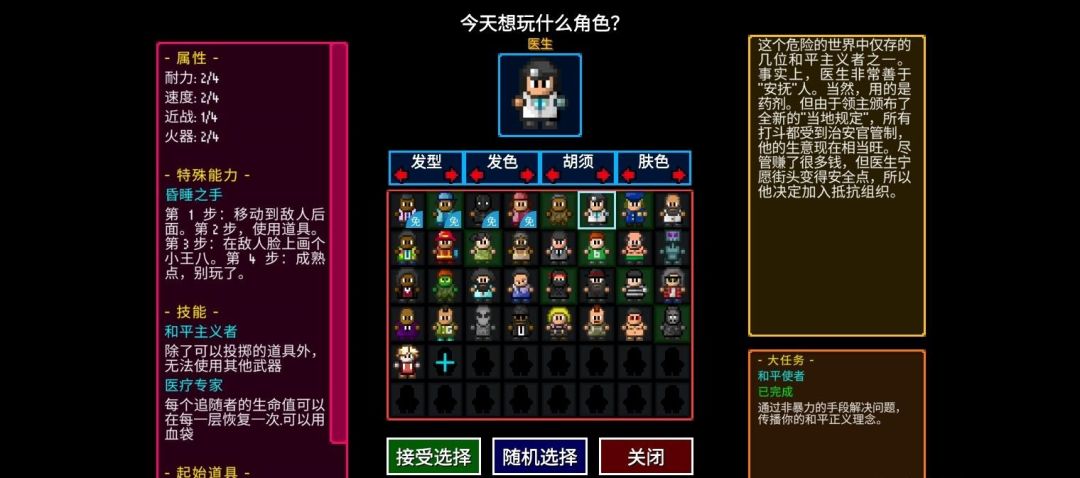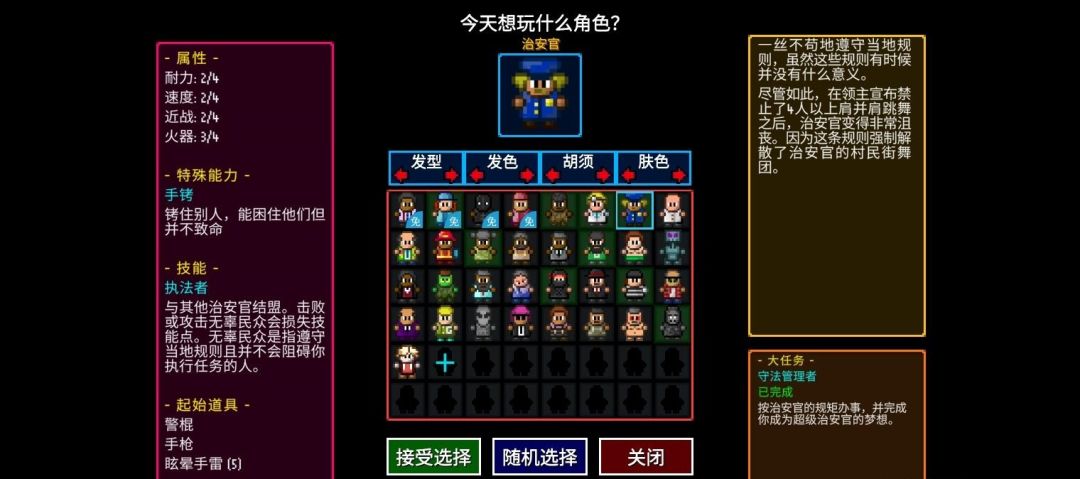 大任务:守法管理者,长按绿色按键即可查看对方的信息,若显示“太坏”则就是坏人,用特殊能力逮捕获得2枚勋章,打死获得1枚勋章,一关要获得10勋章,一大关获得30勋章,一局游戏要获得150枚勋章,当然这个任务和贫民的任务一样前期没完成后期可以补上
