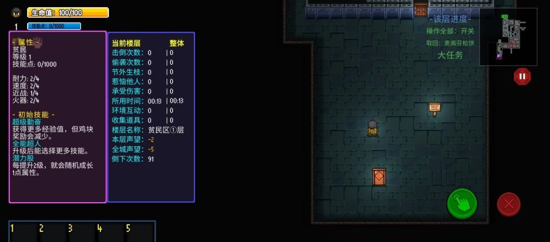 钱武器和防具:技能点下面会显示当前钱数,当前武器,当前带上的防具,由于我是贫民区1层,所以不好展示,这个很好理解,大家可以去游戏中自行探索