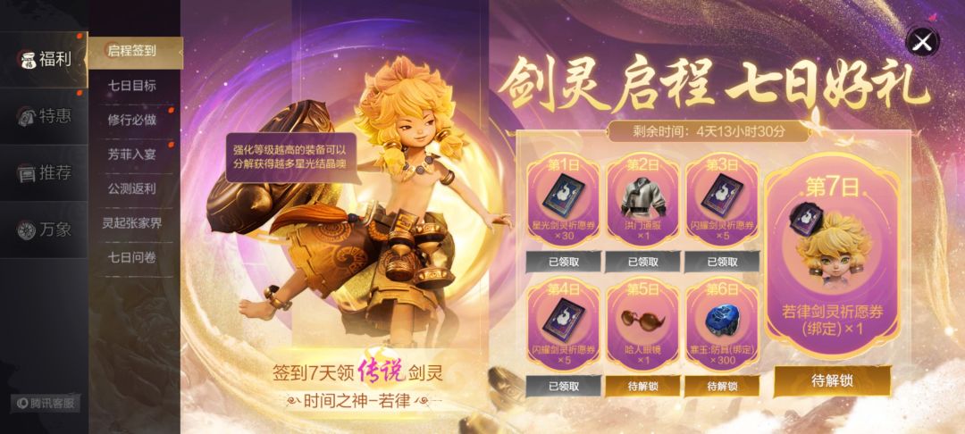 这七日目标的话,除了第一天给的稀有南素荣守护灵会比较好,其他一般般吧,因为在我这四天内,我连抽守护灵的祈愿卷的毛都看不见,一直在用普通的守护灵,所以在我们新手第一天内一定要先把每日目标的任务给做了!只要每天把目标任务做了,不仅能获得到至尊剑灵,下面获得到下面的积攒剑气福利,也有送十连抽闪耀剑灵祈愿卷和星光剑灵祈愿卷,值得拿!新手七天每一天记得给我做,这个玩意不能拖!因为有结束时间的,千万不要错过了!