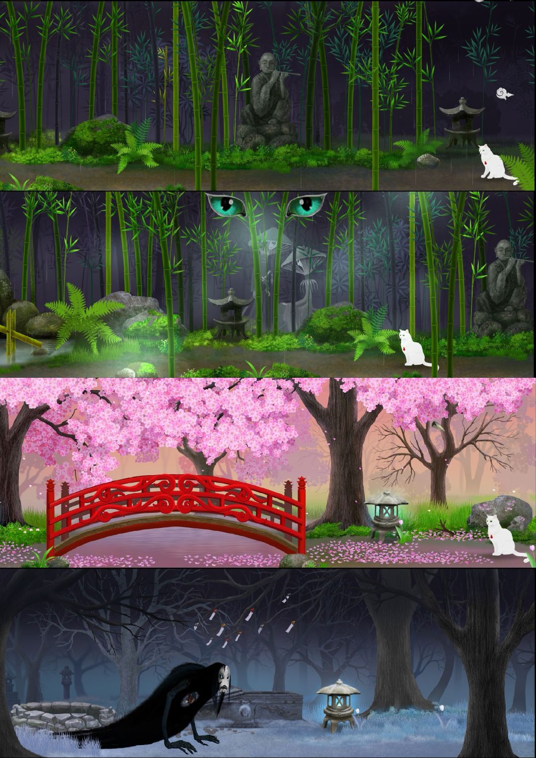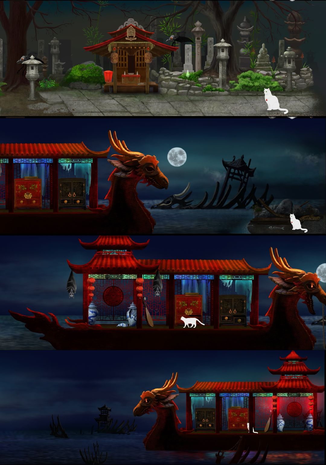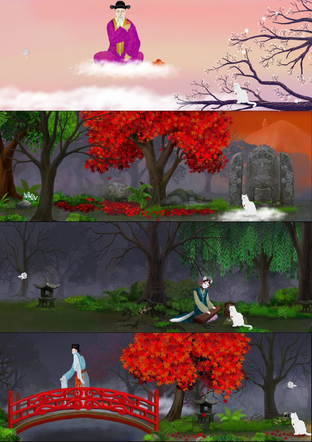 这一路上,白猫帮助了等姐姐的青蛙,遇到了卖东西的和尚,帮助一只鱼变成龙,问候了吞金的龙。之后,来到云端,答应帮云老人拿到凤凰羽毛,换取画家灵魂去处的消息;在森林里释放了被恶魔锁住的古筝姑娘,在竹林里帮孤独悲伤的蘑菇公主找到了陪伴之人,帮吹笛子的石像遮雨,看到了老蜘蛛……终于拿着凤凰羽毛交给了云老人。循着云老人指的地方来到了灵魂园,它才发现被骗了,那儿的一个恶魔要偷走它的灵魂,它用找到的陶笛打败了这个恶魔,离开了这里。
