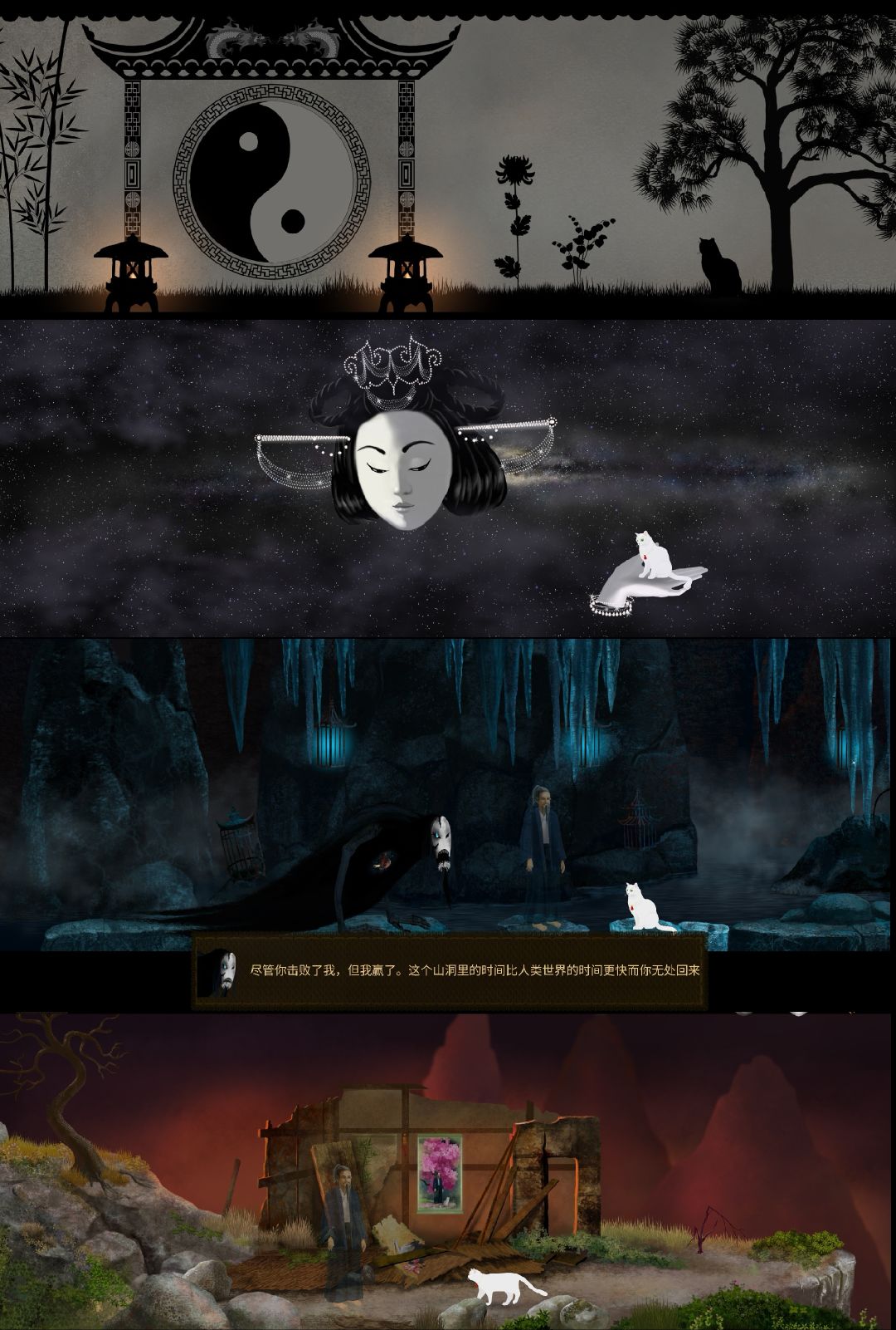 游戏故事曲折感人,让玩家跟着白猫看到世间万物、品鉴人性本心(虽然中文翻译奇奇怪怪,但勉强能懂其中大意)。但同时,游戏的操作很容易让玩家放弃,刚进入游戏的时候会很茫然,不知道要干什么,一通乱点,而且没什么效果,会让人抓狂;耐心点玩下去,就会把握其中的门道:左上角的星星表示可以通过点击触发情境的地方,右上角可以让白猫开天眼、变成人形,能看到幽灵、去到高处;各环节有先后之分,不按次序进行不能触发。总之,游戏画面很精美,剧情很特别,白猫很可爱,值得一玩。(拖延症患者,周四通关的,周六才发帖