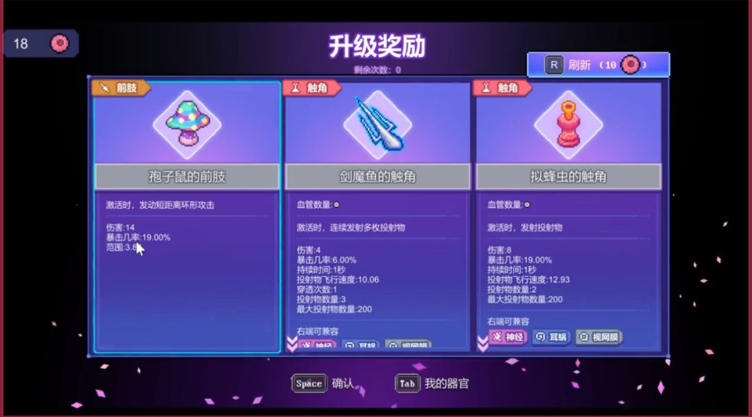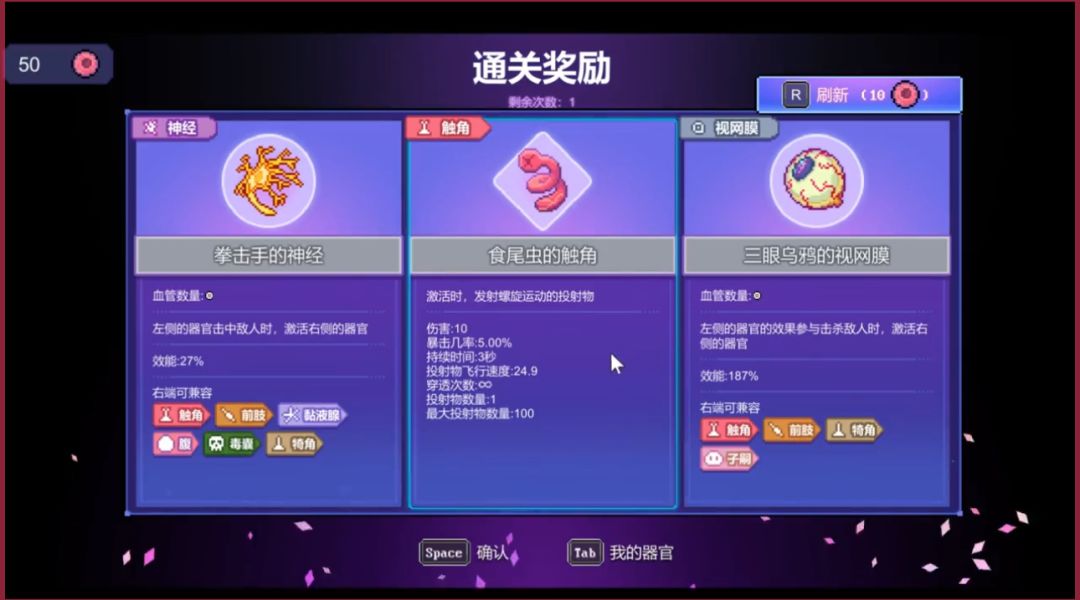 ,我因为刚刚只选了攻击类,所以没办法继续构筑,只能替换一个伤害更高的器官。