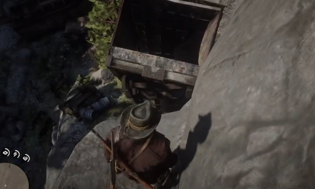 在地图的上方,印第安保留地的下面,科多拉清泉旁边的火车道附近,在下方能看到几节坠毁火车箱,往上走能看到其中一列竖起的废弃火车厢。我们从旁边的小道上去,然后在平台缺口跳过来,就能到火车箱的上部,直接跳进去,在最下面就能得到一根金tiao及其他物品。