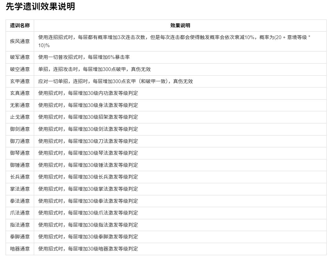 4.先学遗训的等级依赖于根本法等级,最大等级为:1 + 根本法等级 / 3。每次领悟先学遗训需要1张意境卷轴。领悟先学遗训的成功概率只有25%,逐级递减5%。最低概率降低到5%后不再递减。领悟失败不扣除遗训残页。