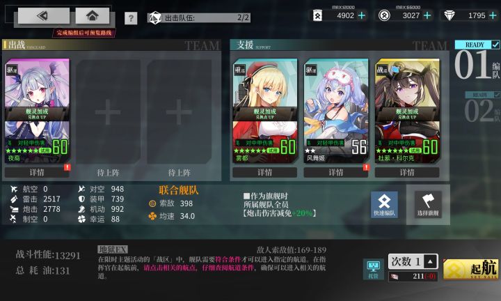 一队打D点和r点m点二队清全程,一路开复纵阵,翻车点在于d点和boss点,d点翻车概率最大boss点翻车概率小,boss点输出不够强化鱼雷和炮,金马达最好有,如果翻车高打不了可以考虑一队减少一个人去打地狱,地狱难度胡德加哈曼能直接打boss不会翻车。