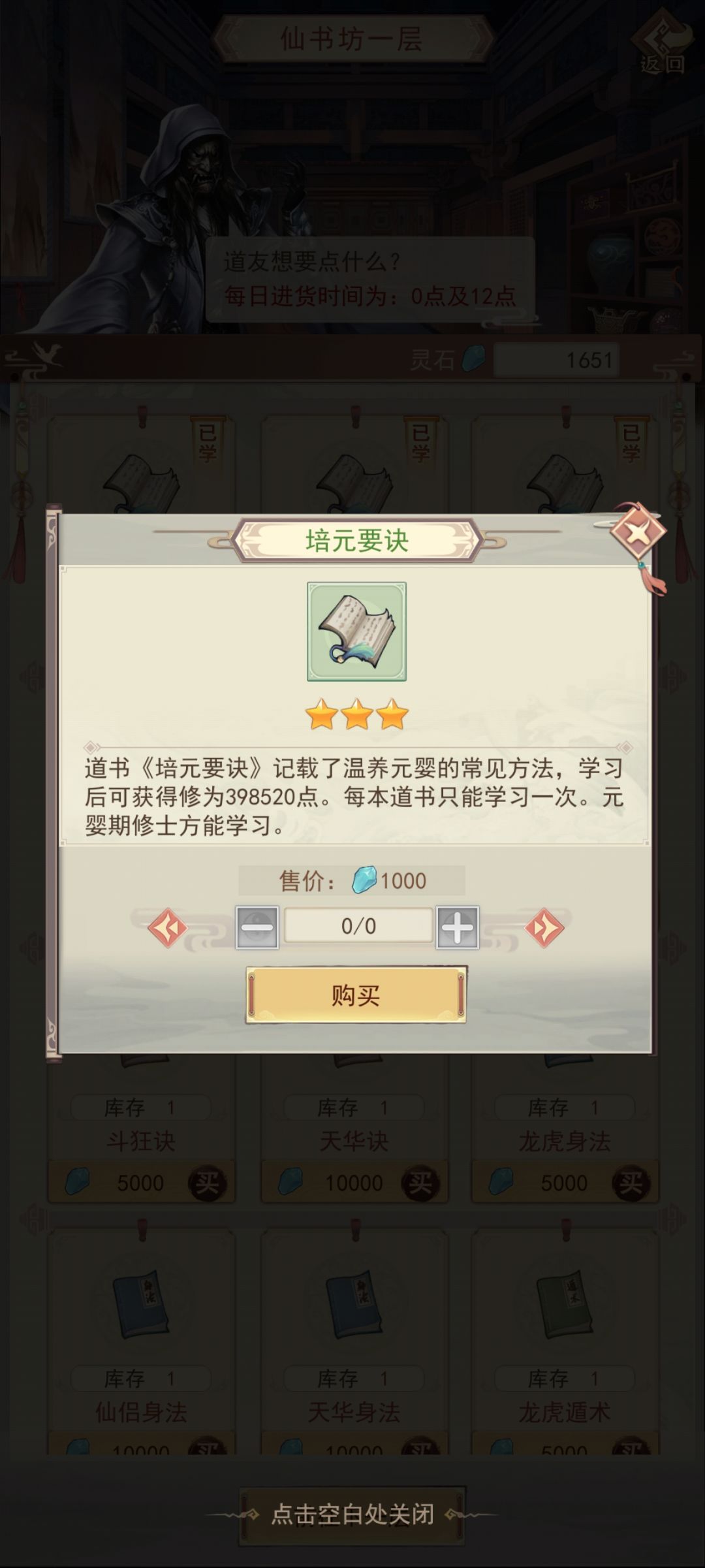 【仙书坊】会在中午12点刷新一次,所以在你进入游戏领完所以兑换码之后,请买空所有的【心得】(在仙书坊)和【轶闻】(在酒馆)