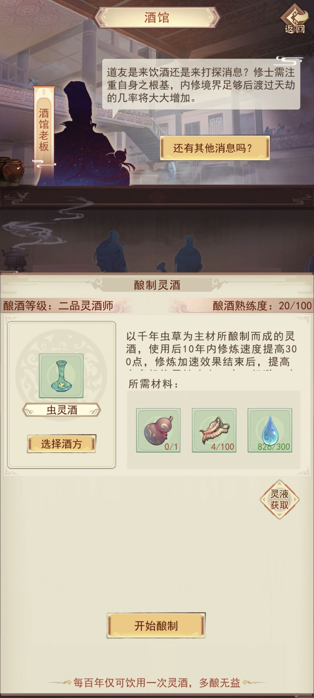 注意:请不要一开始就榨干所有的草,应该先完成酿酒和炼丹两个事项之后再榨。