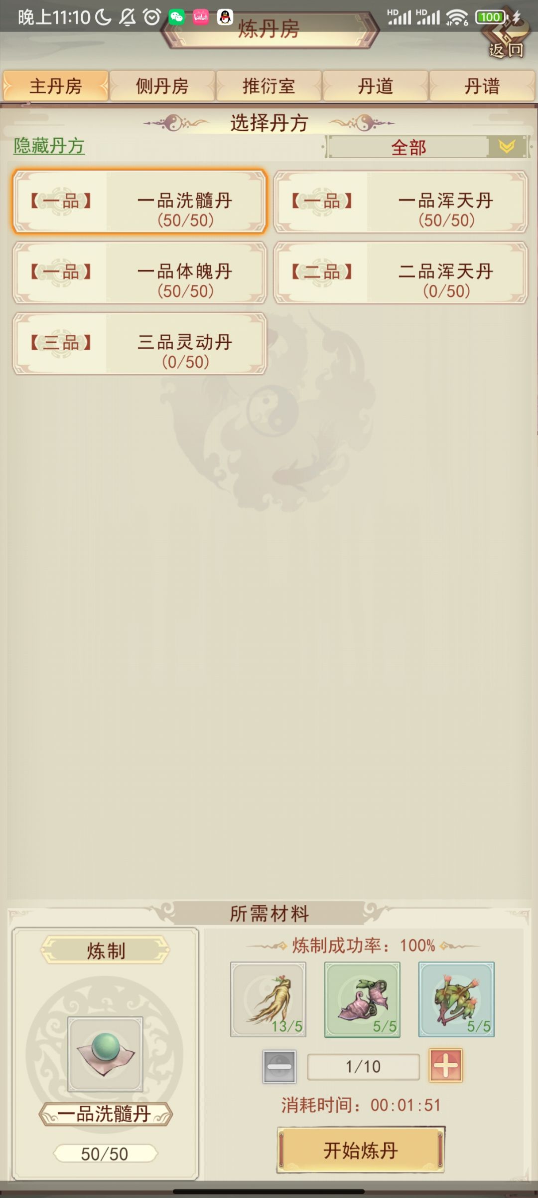 今天我们只炼完一品三维丹并提升酿酒到金丹,其他草药(渡劫用的天材地宝除外)可以全部榨汁练体。