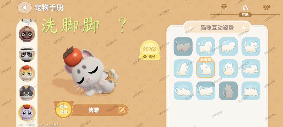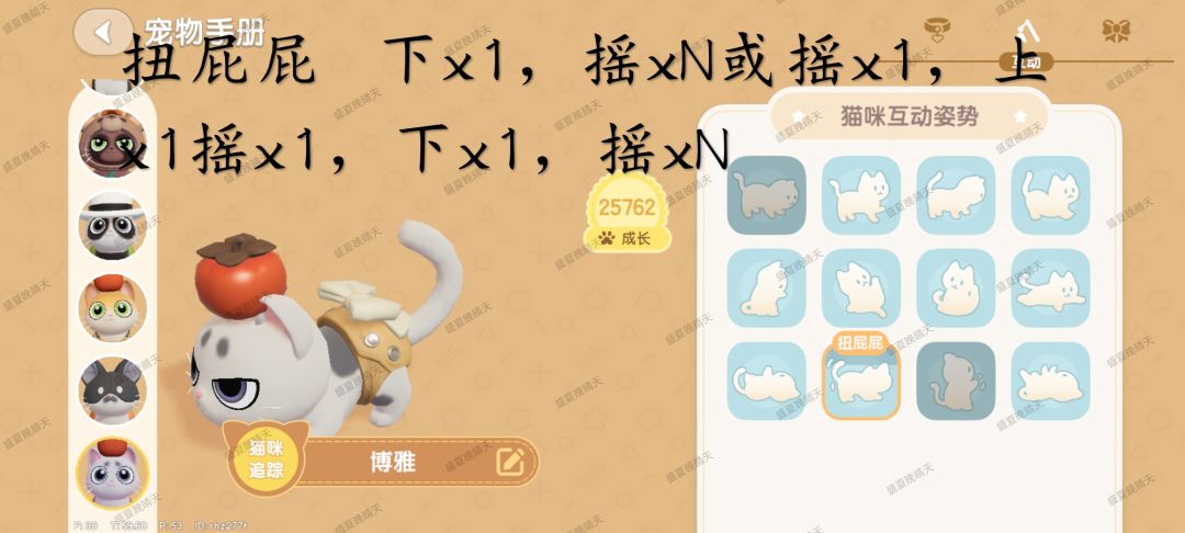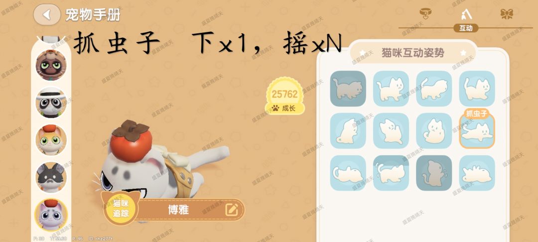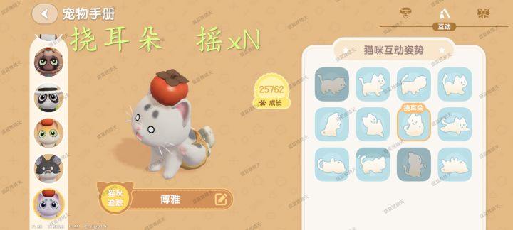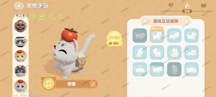 图鉴每只猫共60星,12个动作,每个动作都有1~5星的照片,每天早上5点更新后第一次登陆猫猫送礼会包含1~2张随机照片,前一天和猫猫训练以及互动越频繁,送礼的猫猫成长值越高,送照片高星概率会提升![[表情_送花]](https://img-tc.tapimg.com/market/images/68b3dc8473df915ad2b85da5efef4f56.png)