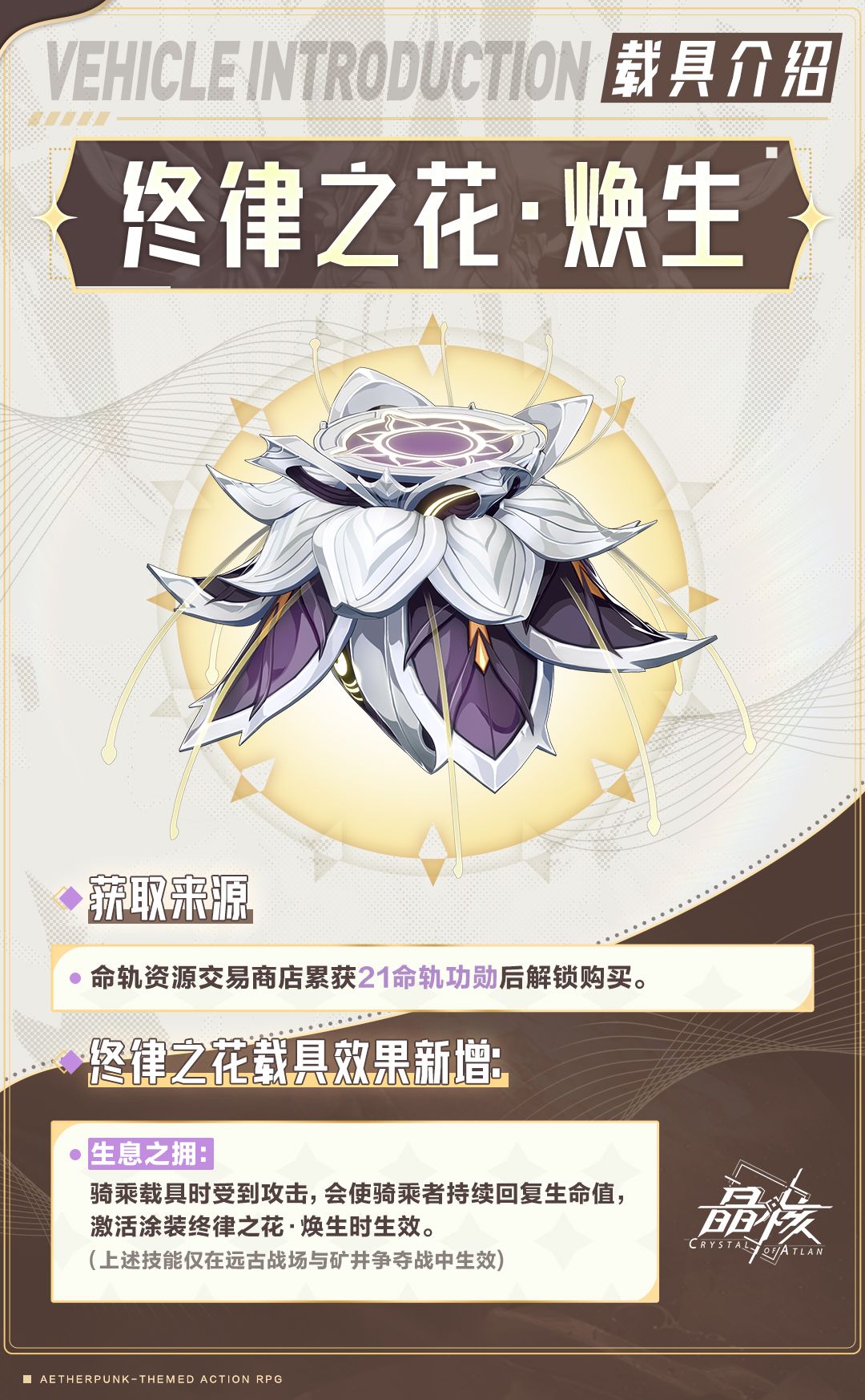 与「终律之花·枯寂」不同,冒险者使用载具涂装「终律之花·焕生」,将激活技能【生息之拥】:骑乘时受到攻击,会使骑乘者持续回复生命值。