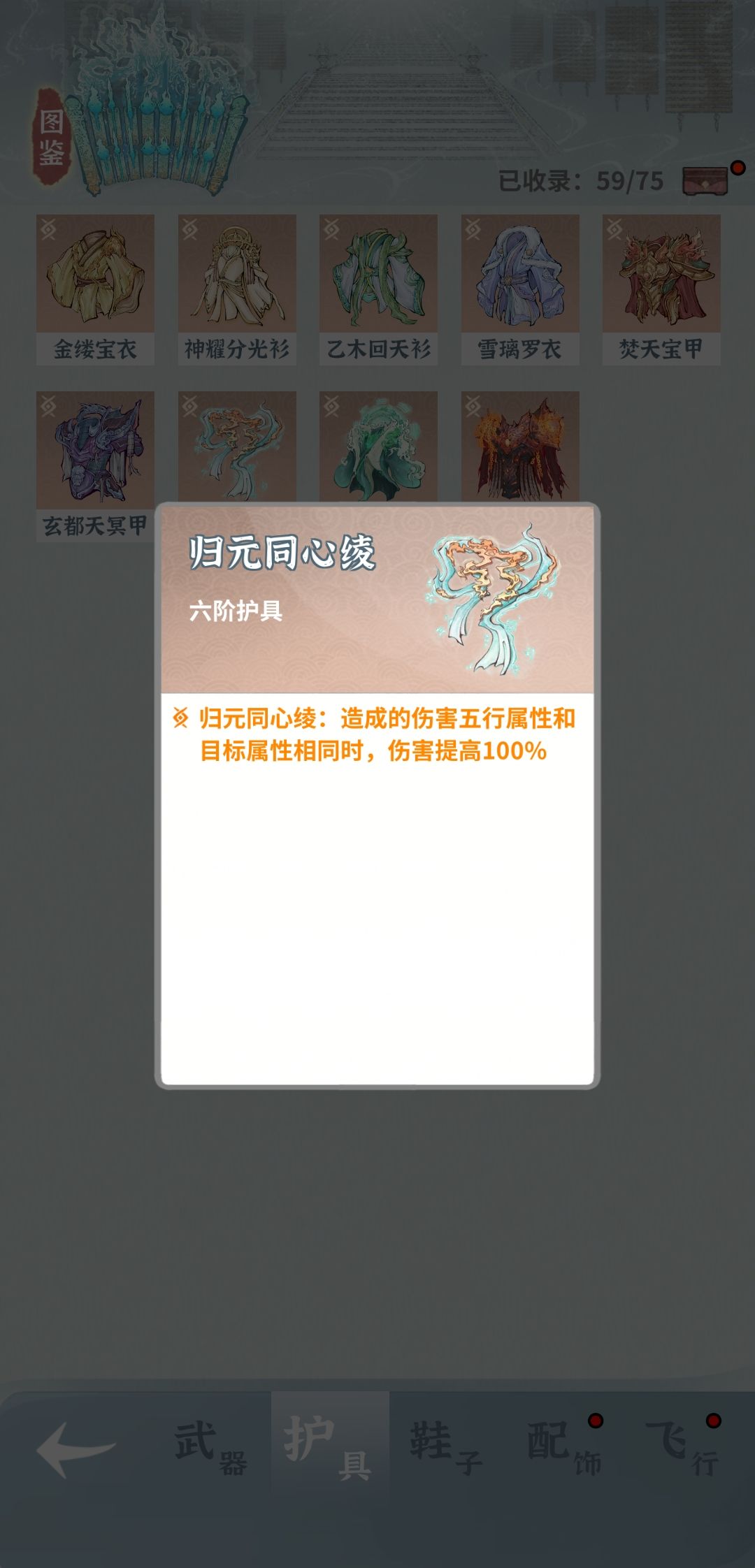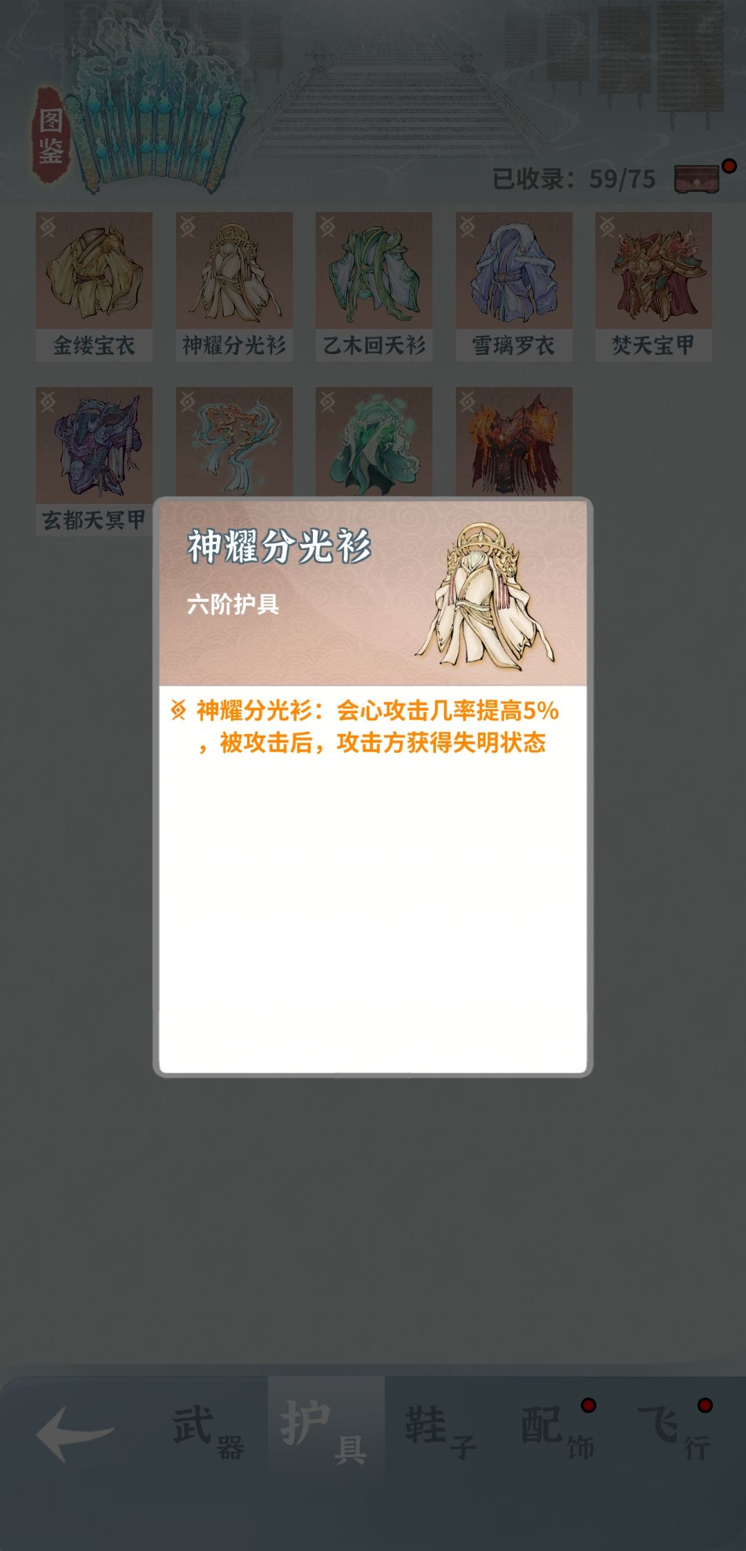衣服:“神耀分光衫”5%会心,被攻击的目标失明前期很好用,后续换“归元同心绫”克制属性加100%伤害