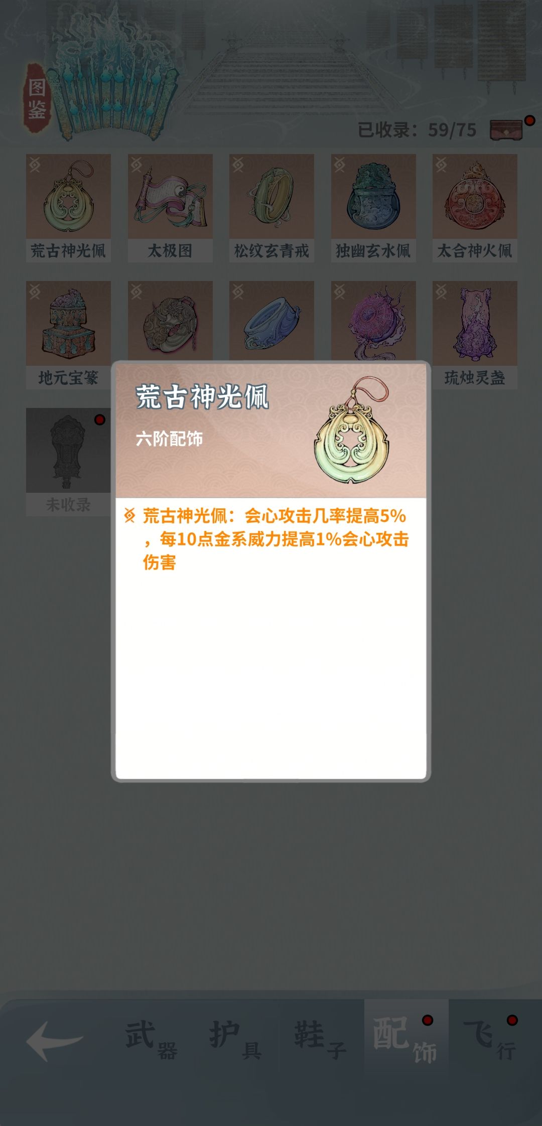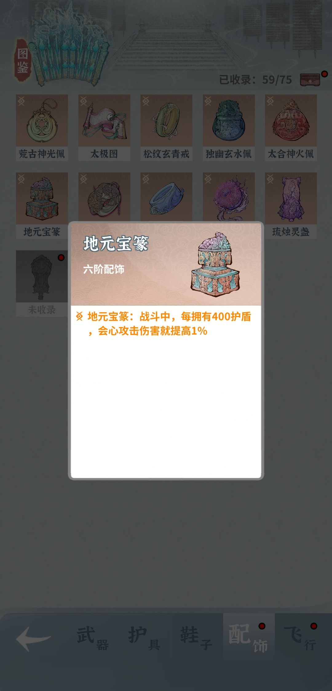 饰品:“地元宝篆”每拥有400护盾加1%会心伤害,“荒古神光佩”5%会心率,10点金威提升1%会心伤害