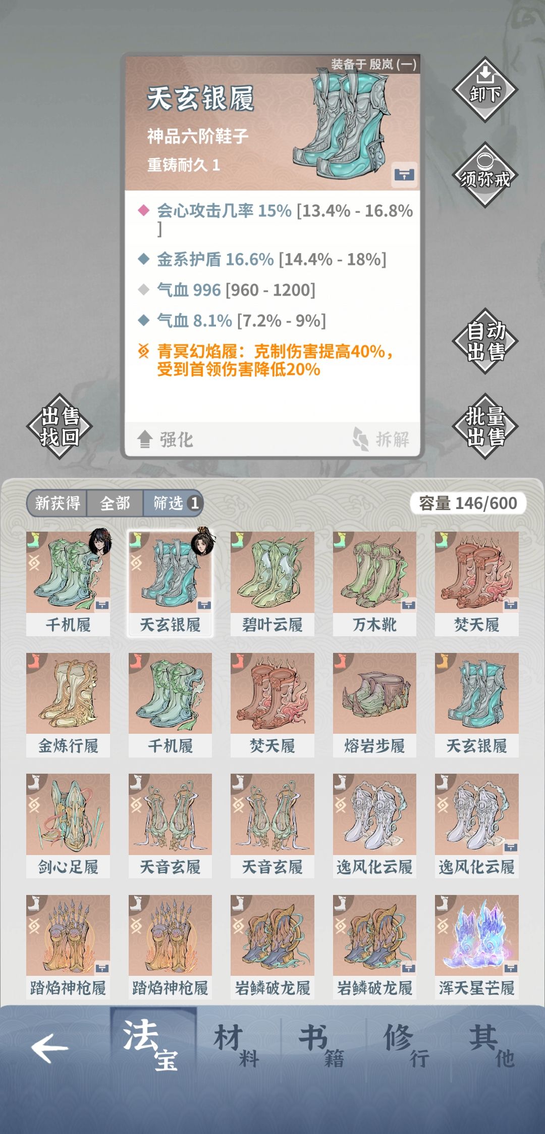 我的思路是刷1层攒灵石,灵石的作用后续面会说。顺便凑5件蓝色词条“会心率”达到50%-60%会心率就够用了,锁妖塔旁边有卖升阶石的,爆到4阶5阶带会心率的装备可以升阶。