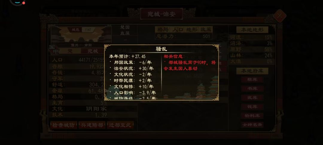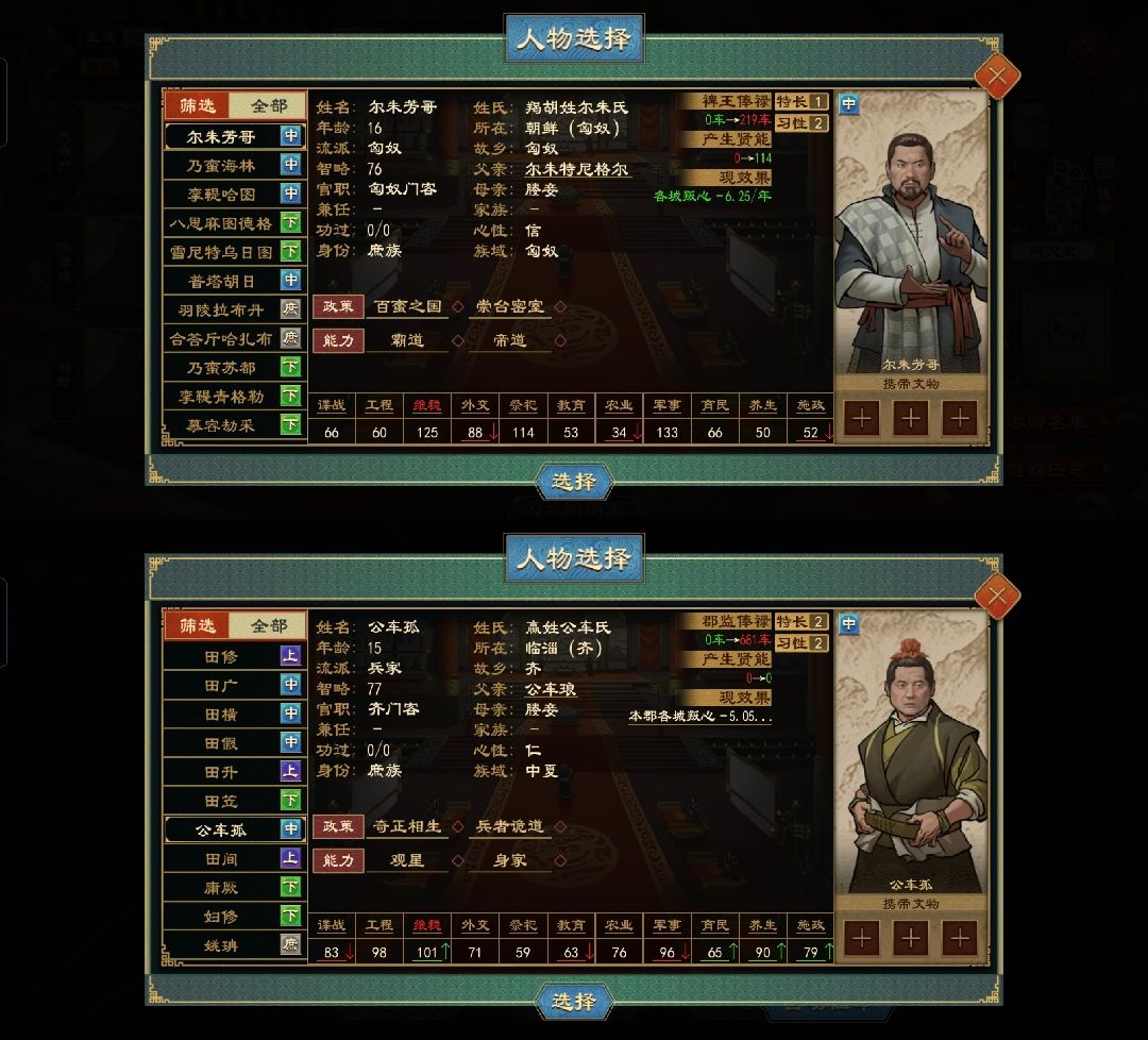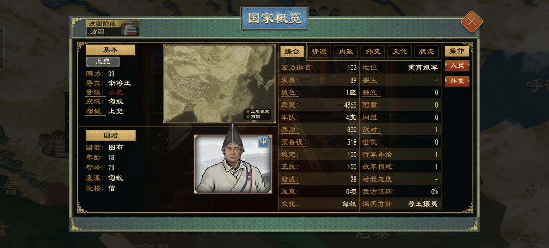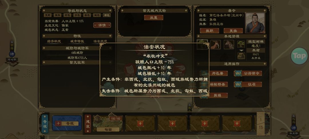 又或者用匈奴卿士,可在新版本,公卿叛乱的概率非常高,即使你的忠诚度拉满,不满值为0,但出镇公卿还是会莫名其妙的背叛,所以这也不是长久之计。至于疯狂种田+政策效益以抵消debuff,想法是好的,但是资源投入大,周期过长,这方法也不在我们的考虑范围内。