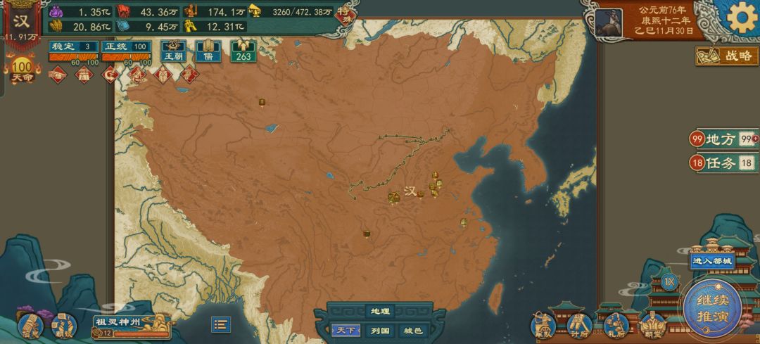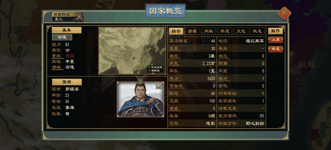 在国家概览可以看到,该势力的族域已经是西戎,所以我们对北漠并没有农牧冲突,可无Debuff直接统治,而且我们文明阶段是圣人阶段,制度和文化与母国基本一致,接下来我们只需稍作调整一番,便可正常对外扩张