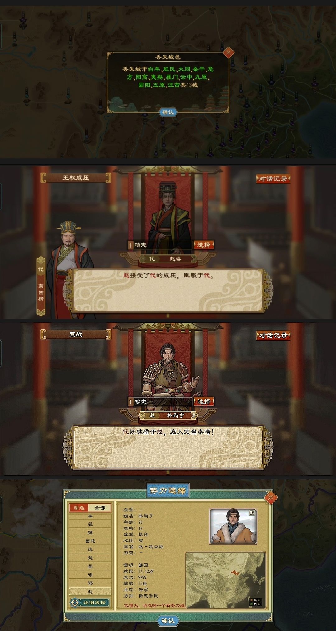 最后一步,我们将其收为附庸,把自己的所有城邑都加封给他,后对其宣战,快要灭亡自己时切旁观模式,灭亡自己后就可以选择这个势力了