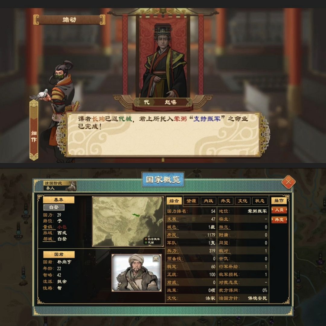 那么又说回开头,如何消除北漠这些debuff,而非抵消?据我观察,游戏里叛军有一个设定,叛军的族域通常是由城邑所在位置和母国族域决定,且叛军的文明阶段一定与母国一致,典章国制与母国也大差不差,也就是说我们可以利用这个机制复活已经灭亡的族域国家,甚至可以衍生出其他特殊玩法。
