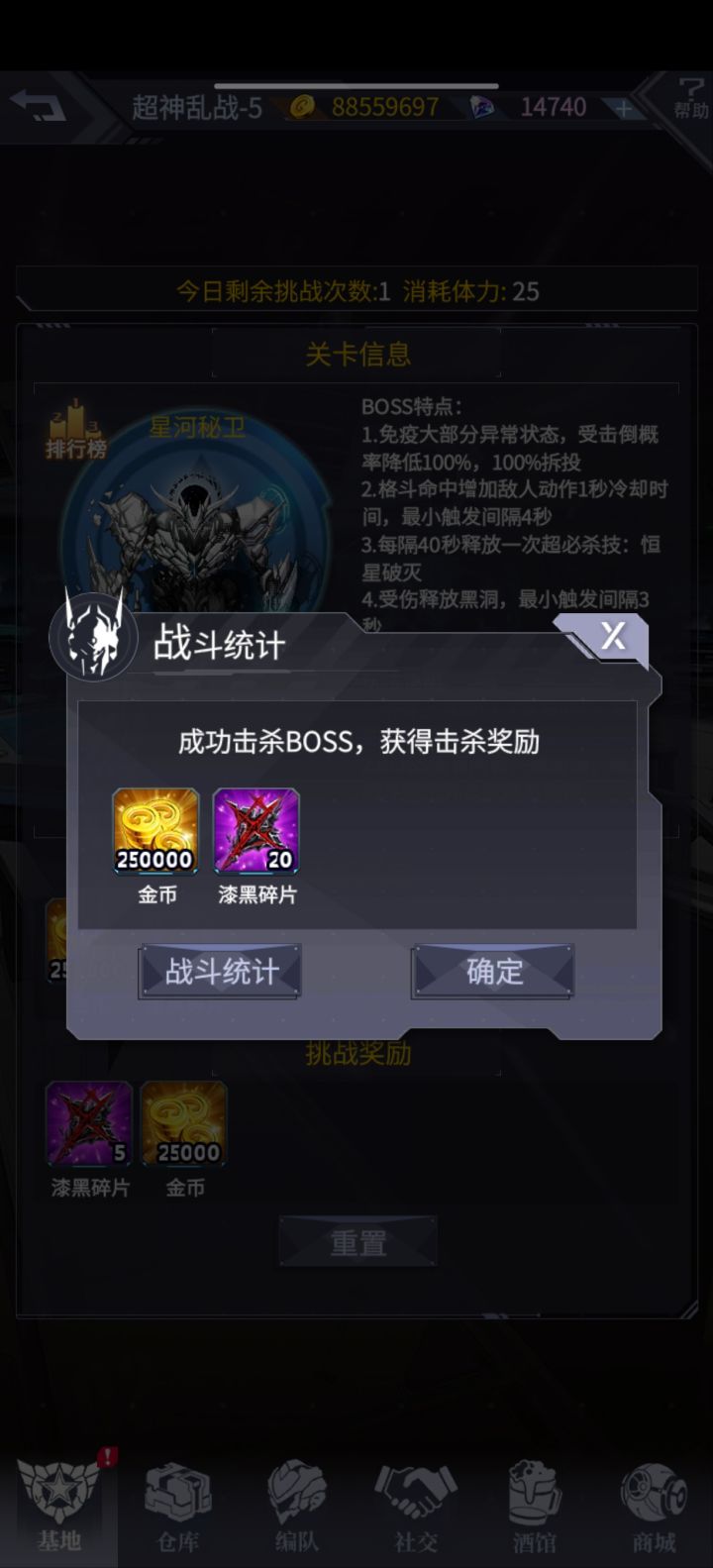 剩下的体力打boss,每个boss每天都能打三次,25体换20碎片加25w金币,相当于5碎片换25w金币,很划算,打完第一个怪就退算完成击杀。