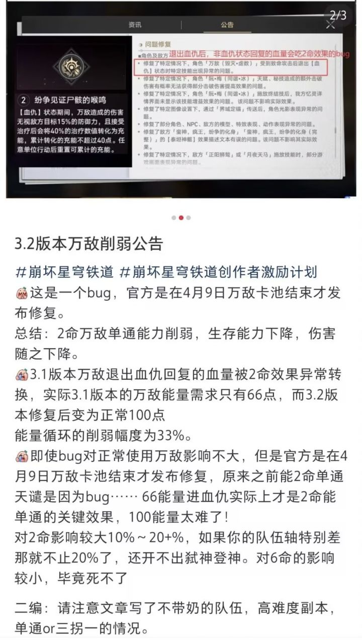 也就是说之前看到的万敌单通仰卧起坐是bug,万敌测试服正式服都有很多发单通视频的为什么偏偏万敌卡池结束才发现并修复,既然已经卖完了现在“修复”是想怎样。崩铁有一半的人抽卡都是找几个视频看看舒适度或者强度,以前二命万敌能再进血仇的环境等卡池结束了就进不了了,现在大家都知道万敌单通强,有多少人会关注二命的修复呢?
