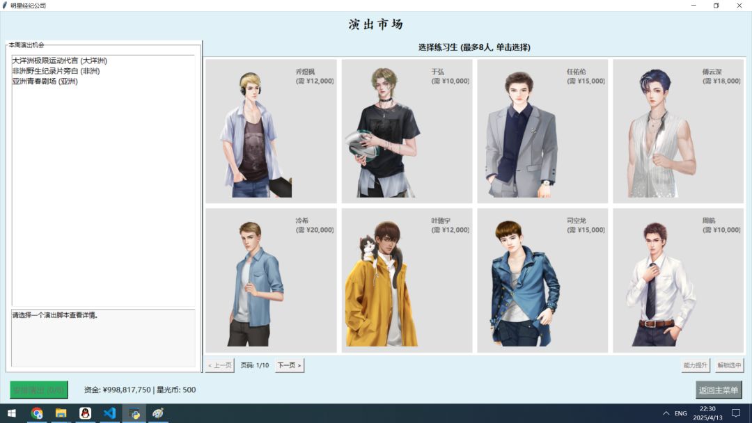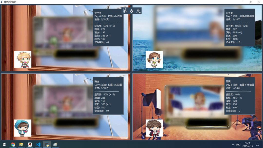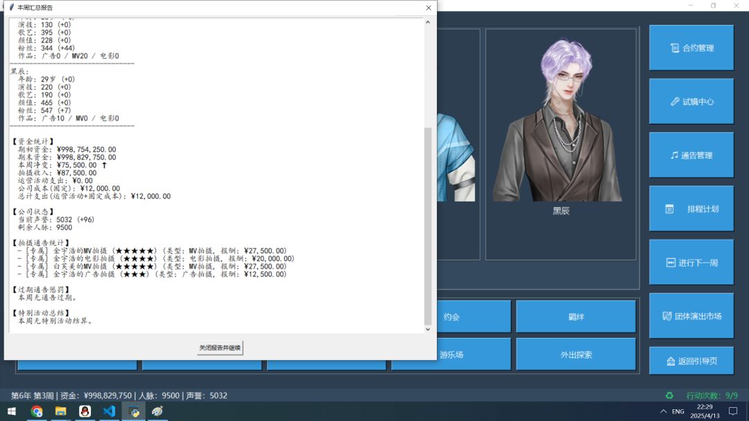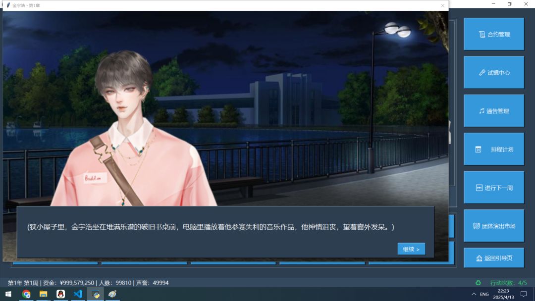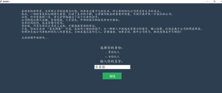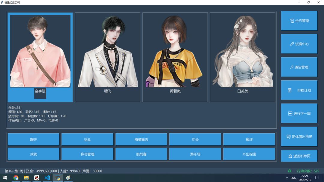 制作感言:许多个日夜,与众多玩家一样,我也在静候《明星志愿》的下一段星光。那份关于梦想与奋斗的悸动,是少年时代难以磨灭的印记。等待漫长,热爱不减,多年来有心积累终于决定尝试延续那点热爱。是致敬也是为了圆梦,或许粗糙但满载诚意。希望能与同样心怀美好的你,共同续写未完的故事!完整的游戏源代码已在QQ群951379280免费开源发布!或者百度网盘链接( https://pan.baidu.com/s/1MO2BoSU0TD_d09EYBNuYRA 提取码: re7a)。欢迎您参与共同制作!