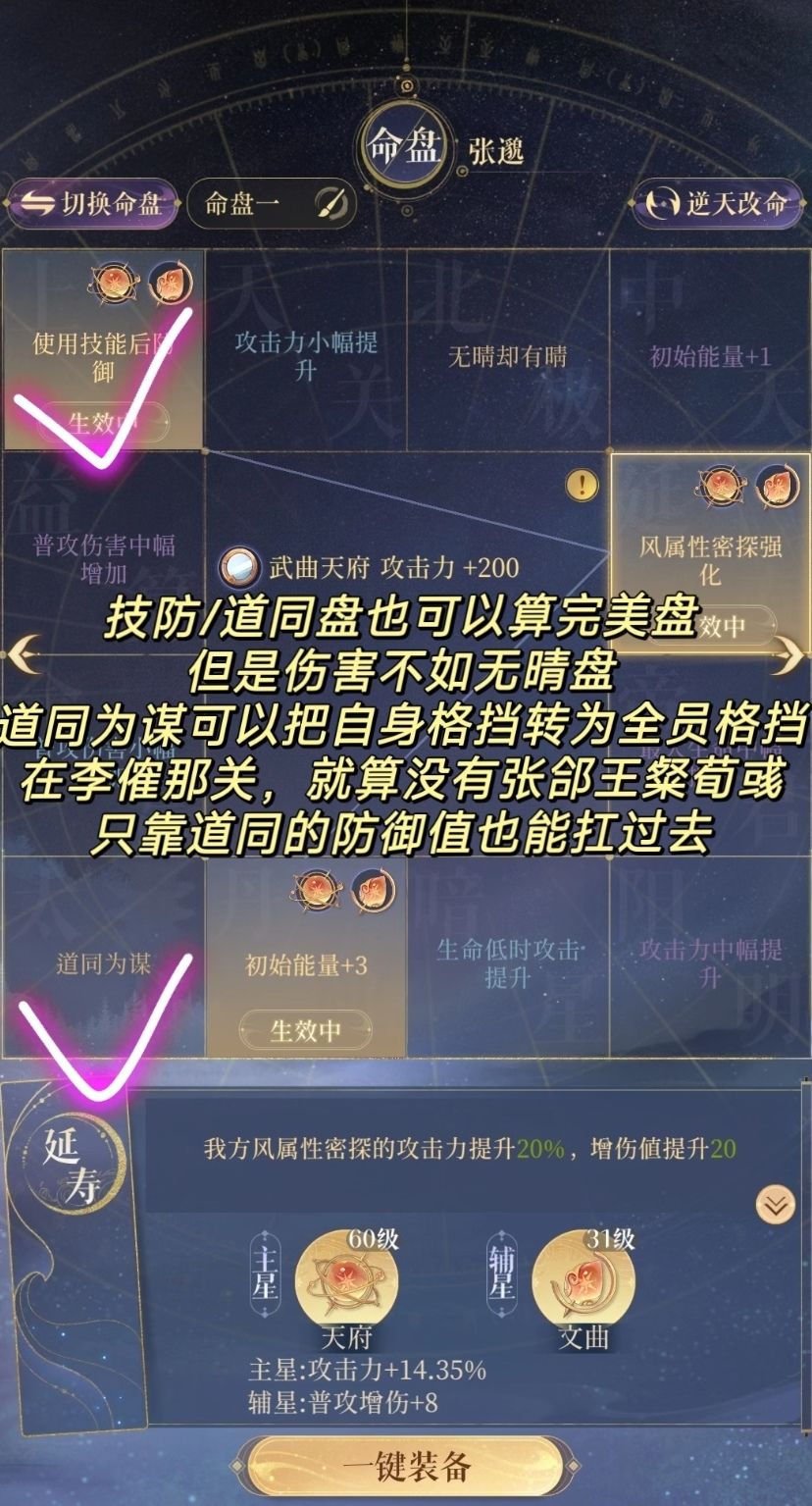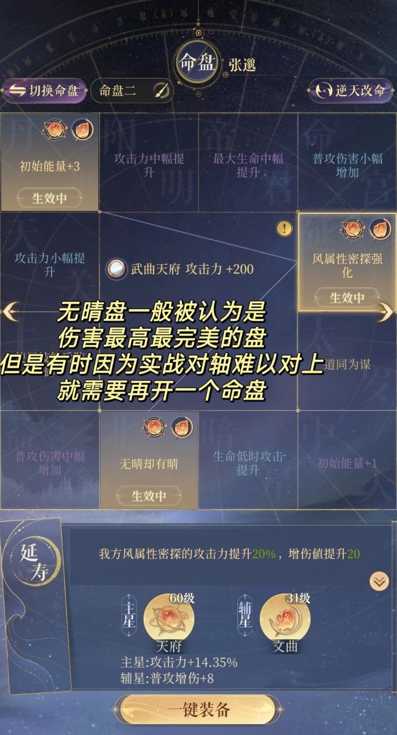 …这里不得不多提一句,建议殿下开双命盘。因为无晴盘在一些对局中,对轴难以对上,不如道同和技防方便,但是无晴盘的伤害更高,含金量极高。