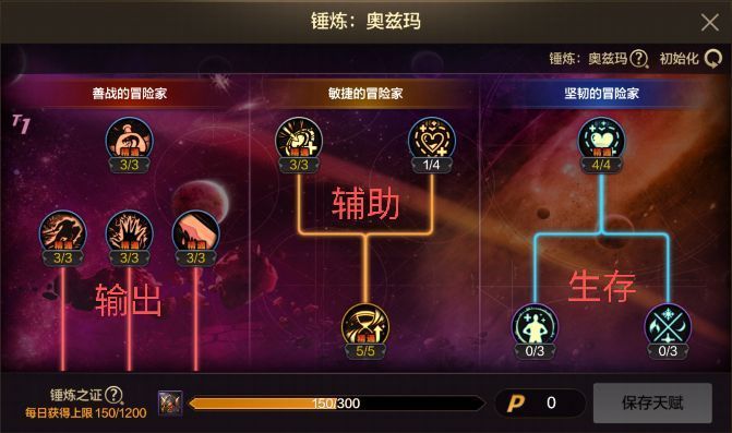 这样其实能够看出,“锤炼:奥兹玛”技能属性选择,其实更加偏向于“善战的冒险家”,也就是“输出”方向,我们需要将更多的天赋点用于该技能树。