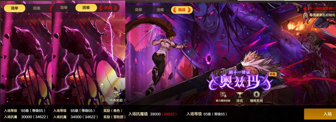 降临奥兹玛开启分为三个难度,分别是简单、困难和挑战,简单入场抗魔29000,困难入场抗魔33000,挑战入场抗魔39000。