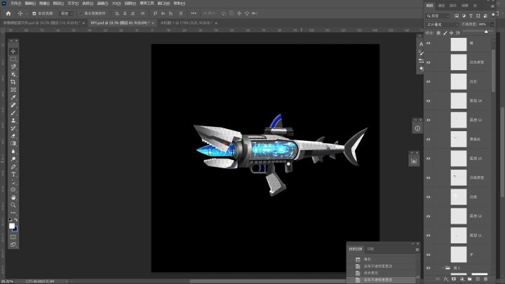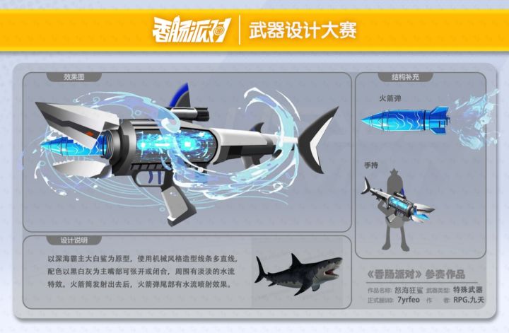 设计说明:以深海霸主大白鲨为原型,使用机械风格造型线条多直线,嘴部可张开或闭合,周围有淡淡的水流特效。火箭筒发射出去后,火箭弹尾部有水流喷射效果。
