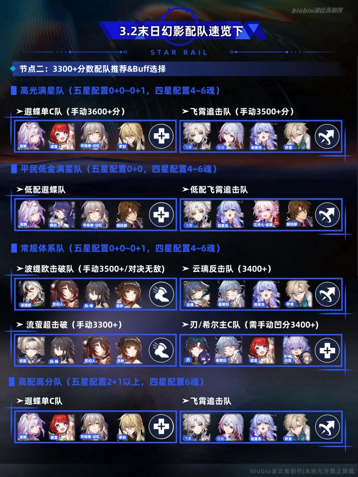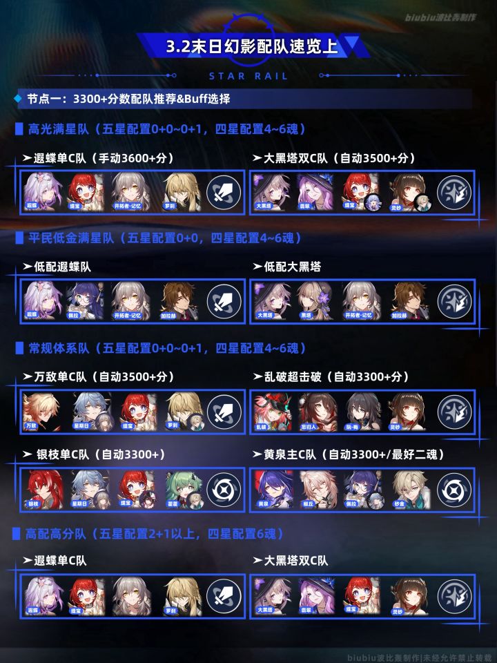 本期末日幻影整体难度有所提升,重点是要选取能应对boss机制的配队,才更易拿满奖;大buff与敌人环境较利好记忆命途输出与战技为主要输出的体系,六个小buff依旧涵盖多个方面,但整体可选配队却需仔细考量,简单来说上半选择以群攻伤害为主的队伍,下半选遐蝶/飞霄/波缇欧均可;