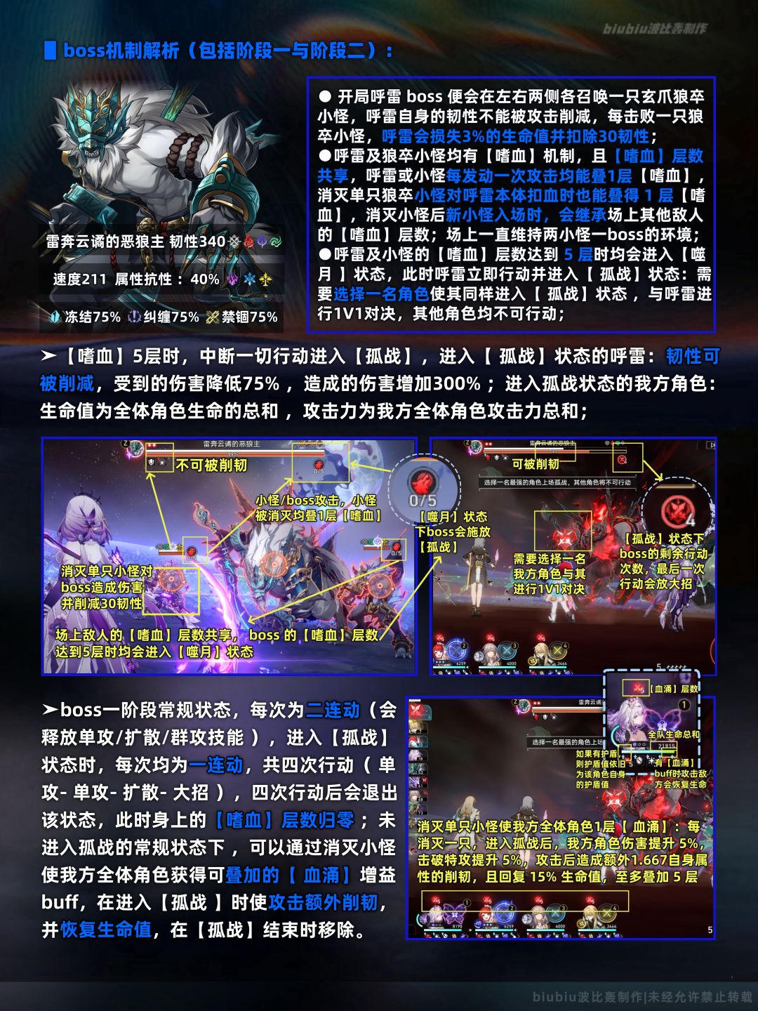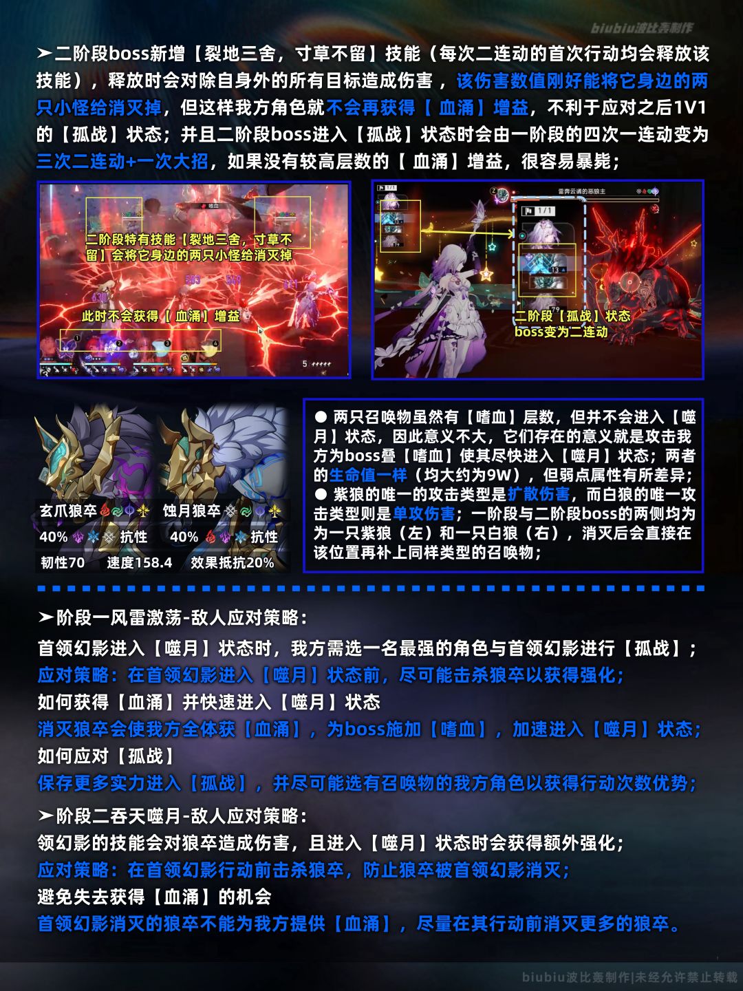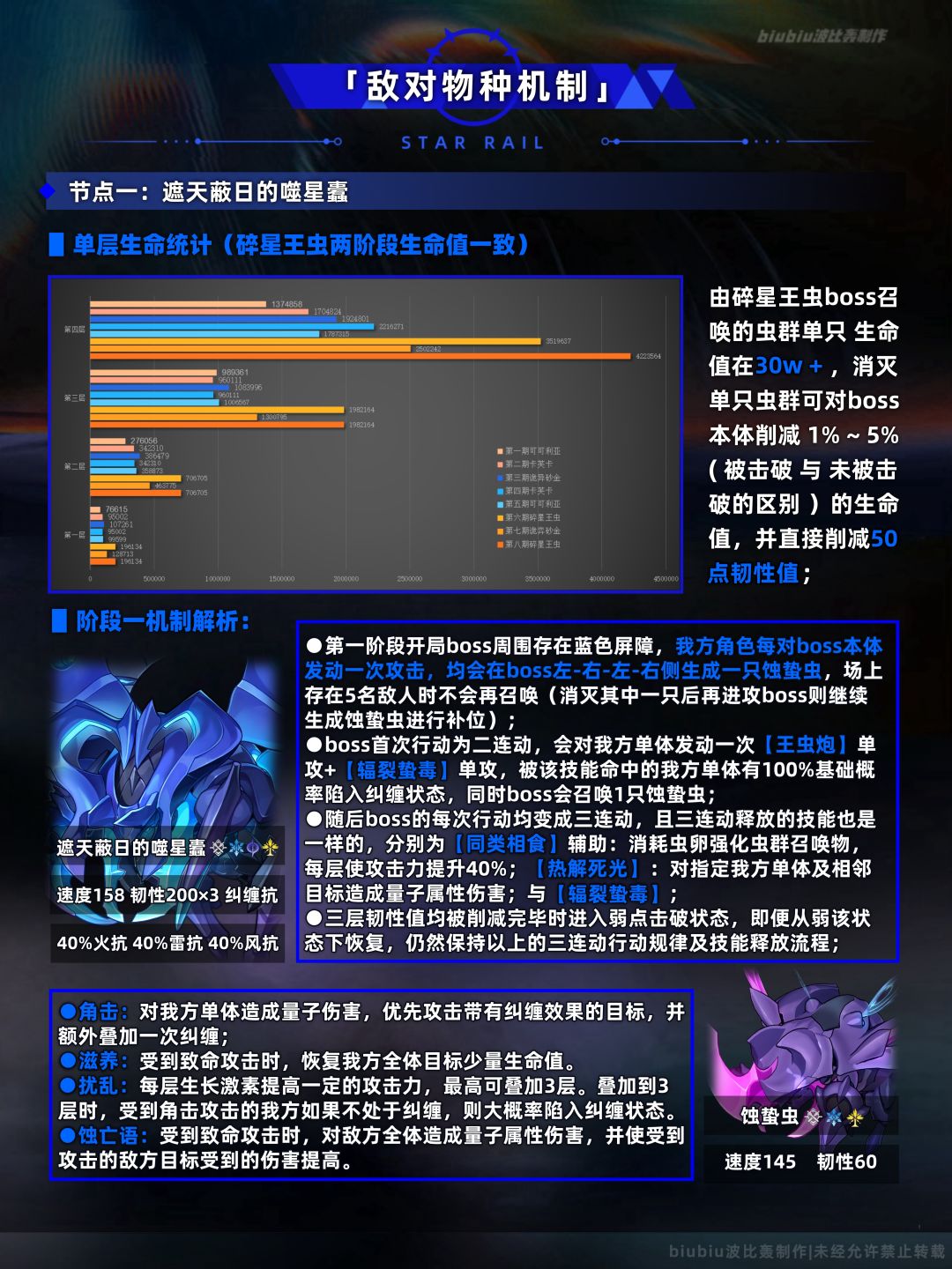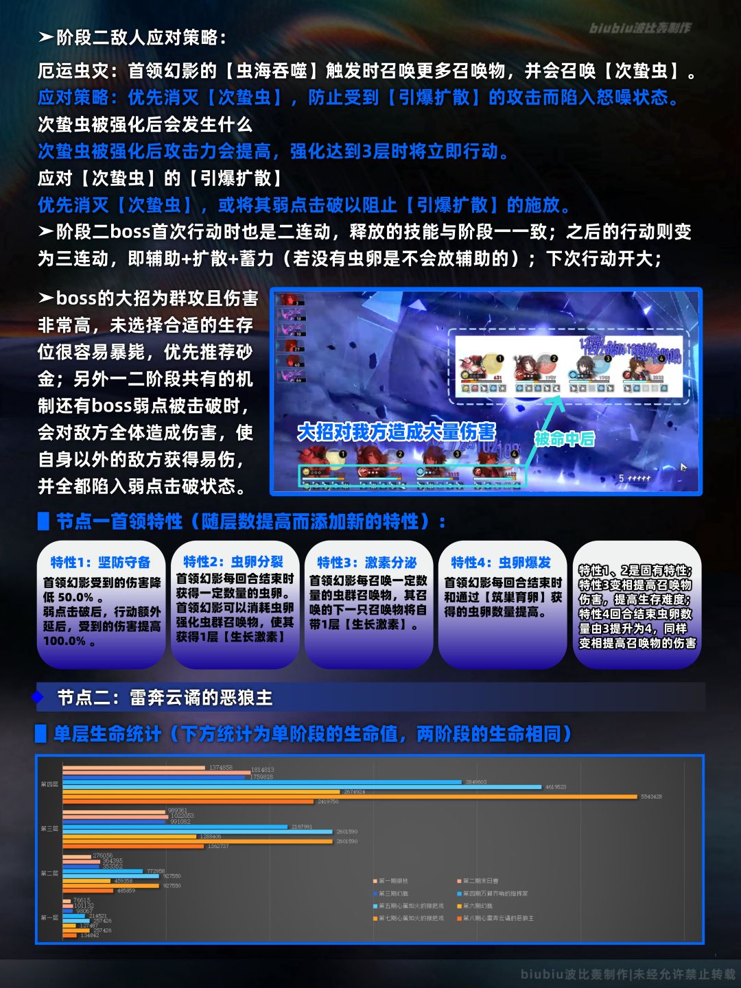 上半间的碎星王虫我们在3.0版本的末日幻影已经遇到过,机制上与那一期的一样,只是生命值有所提高;其难点是生存可能会有一定问题,小怪有优先攻击陷入纠缠角色的机制,场上小怪连续进攻单名角色很容易暴毙,因此回合外有解控手段的角色优先考虑;下半间则是首次加入末日幻影的boss呼雷,它的机制与混沌回忆大不相同,特点是孤战1V1机制,需要选取出手次数较多或弱点击破效率较高的角色来尽快对其造成弱点击破以触发末法余烬;