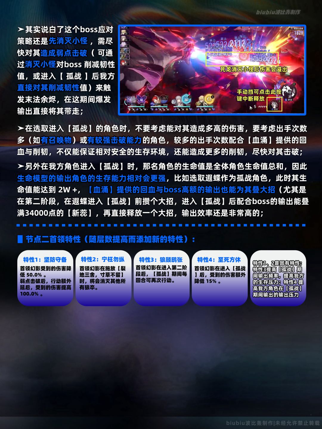 无论是上半下半间,若选取遐蝶队我都建议手动存续死龙,因为遐蝶死龙的伤害很高,应对小怪时伤害往往会大幅溢出,在消灭小怪后手动点击Q按键终止继续释放,这样能喷更多波次的小怪;当然若boss被弱点击破或下半进入【孤战】状态,就直接释放完整即可,这样操作,下半boss两阶段均只用进入一次【孤战】状态即可对其造成弱点击破,大幅降低行动值的消耗;另外下半间选取飞霄这样单攻输出队自然也要手动,将输出侧重于小怪,否则只去输出boss不仅不会触发机制,而且伤害极低,会浪费大量的行动值;