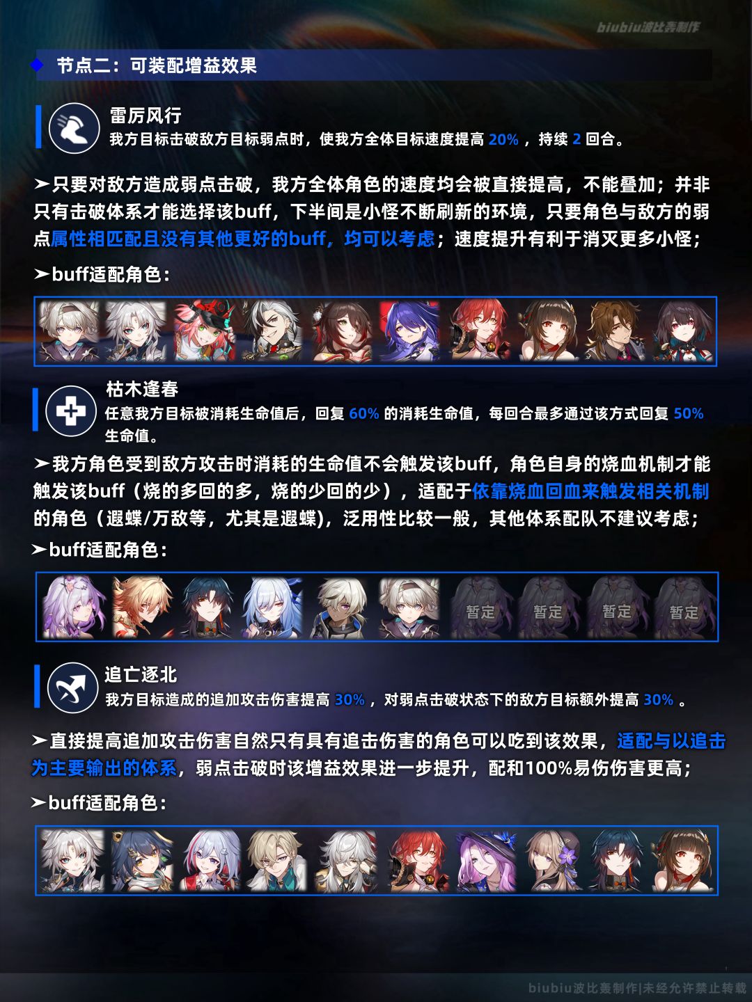 上下两间均有利好遐蝶的buff,且大buff提供的忆灵技易伤进一步提高其伤害,所以抽了遐蝶的这期应对起来还很容易;当然大buff提供的战技易伤与小buff1提供的抗性穿透,依旧为大黑塔在上半间留足了就业空间,下半则为与呼雷机制适配较高的飞霄留了一追击增伤buff;